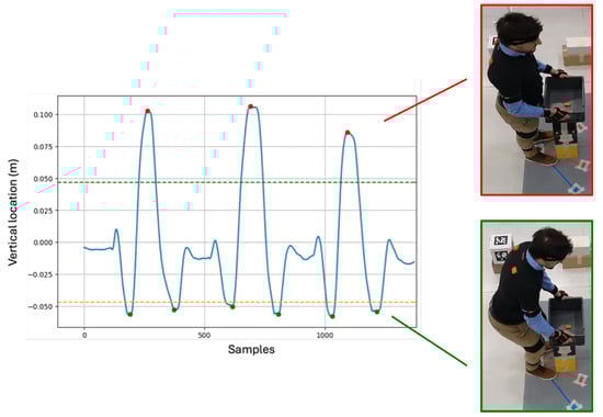 Vertical location of the right wrist during the lifting task. The colored dashed lines represent the threshold (positive in green, negative in orange) used to identify the negative (green dots) and positive (red dots) peaks.