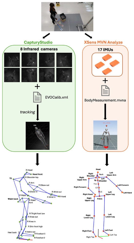 Pipeline of the experimental procedure. For each acquisition, simultaneous recordings of infrared (IR) sequences and IMU signals were performed. In the CapturyStudio software, IR sequences (8) and the calibration file (EVOCalib.xml) enabled the 3D reconstruction of the scene. After a tracking process where a generic skeleton was overlaid on a sample sequence, the subject-specific model of the skeleton was reconstructed. By exporting the skeleton, a graph composed of 42 keypoints/green circles) was obtained. Similarly, in the Xsens MVN Analyze software, the subject-specific model was derived from the scaling of the Xsens Human Body Model according to the subject’s measurements (BodyMeasurement.mvna) and the recording of the 17 IMUs. Then, the 23-keypoint skeleton was exported. Arrows indicate the sequential steps of the processing pipeline.