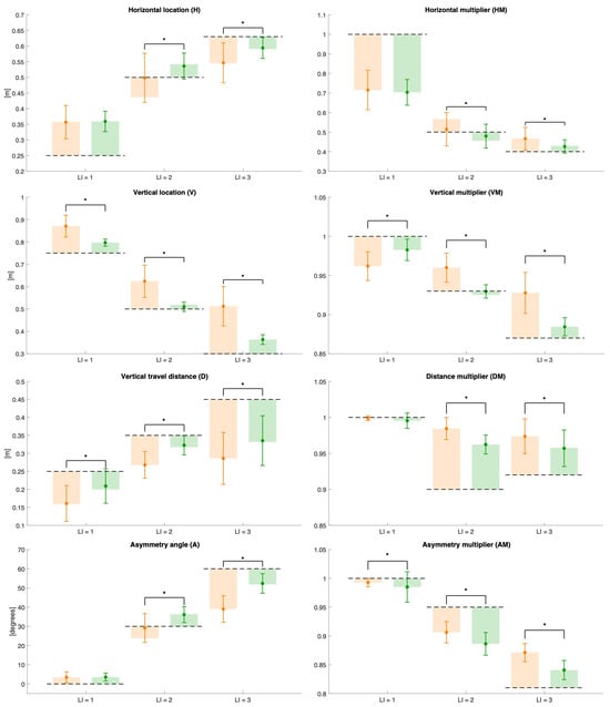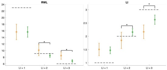 Error plots of the resulting RWL and LI across all risk conditions for both methods (wearable sensor network in orange, ML in green). The dotted lines indicate the reference values, while asterisks denote statistically significant differences between the two approaches.
