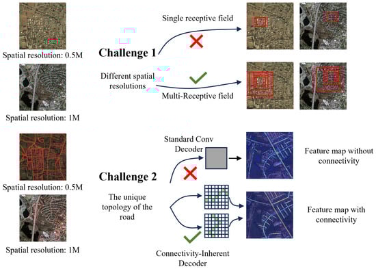 Road extraction, as a critical task in remote sensing semantic segmentation, holds significant importance for urban planning, disaster response, and navigation systems [1,2,3]. However, unlike structured objects in natural imagery, roads in remote sensing images typically exhibit sparse distribution, elongated structures, and complex topological configurations. As shown in Figure 1, particularly in multi-resolution scenarios, severe mismatches in the receptive fields between images of different scales pose significant challenges for existing models in preserving road connectivity.