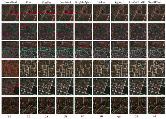 In summary, TopoRF-Net not only outperforms existing methods in pixel classification accuracy but also exhibits significant advantages in structural connectivity. Visualization results demonstrate how this approach can more accurately reconstruct the continuous skeleton of road networks in complex remote sensing scenarios, providing a more reliable foundation for subsequent traffic flow modeling and path planning.
