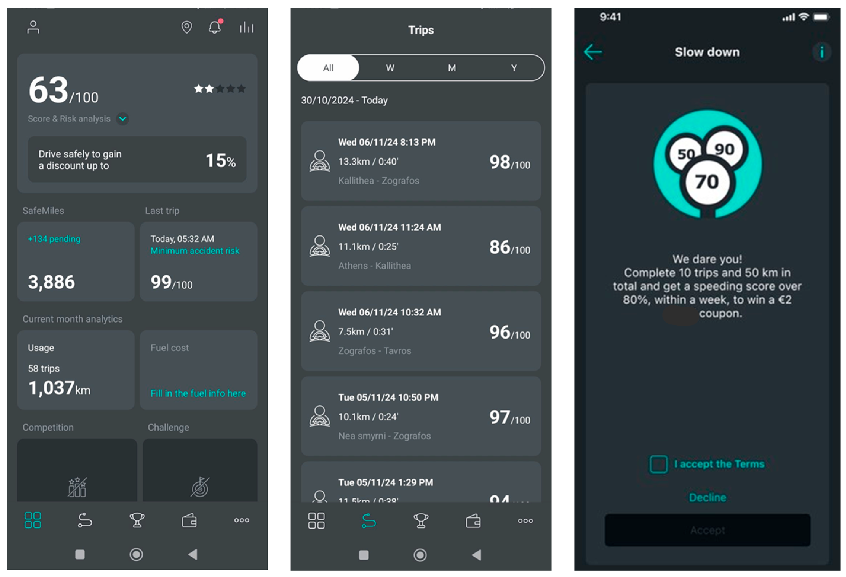 | 1 | 10 trips, 50 km, >80/100 speeding | 5 December 2024 | 27 December 2024 | 2 € coupons |