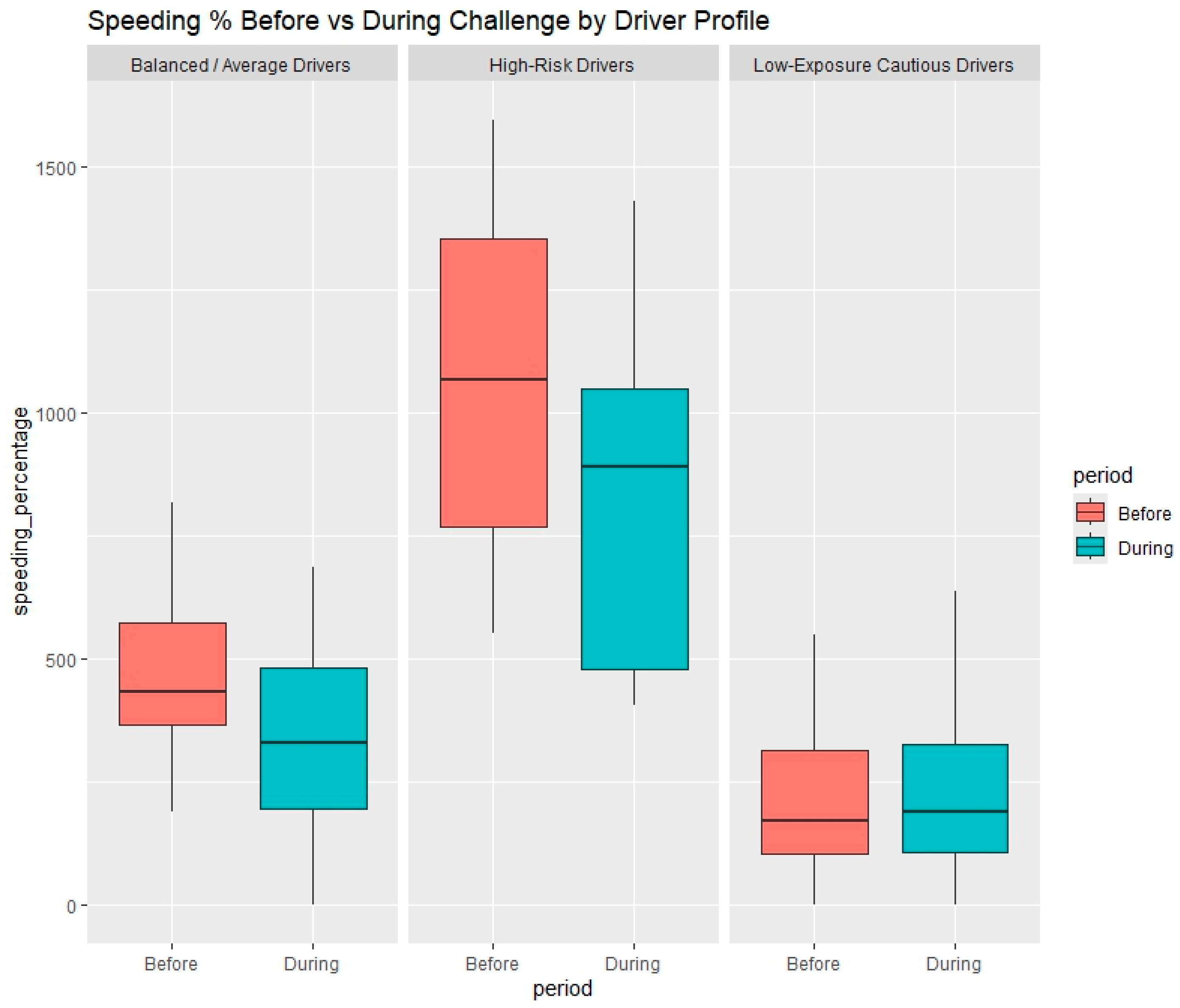 - Balanced/Average and High-Risk Drivers showed statistically significant reductions in speeding during incentive-based challenges, confirming the positive impact of gamified feedback schemes.