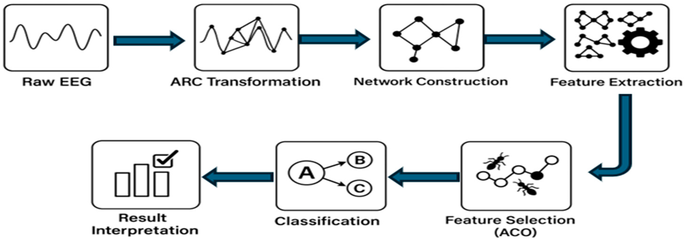This section provides in-depth detail about the proposed CONECT (Complex Network Conversion and Transformation) framework. It covers the importance of the novel Angle-Relation Connection (ARC) Rule in the EEG signals for complex network transformation. In the feature extraction section, two newly developed features (Weighted Angular Irregularity Index (WAII) and the Curvature-Based Edge Feature Index (CBEFI) are proposed that provide valuable insight about topological complexity and temporal geometry of EEG signals. In the feature selection section, we discussed the rationale for the first-time use of the Ant Colony Optimization algorithm in feature selection for dementia-related EEG signal analysis. Overall, the CONECT framework comprises five key stages: