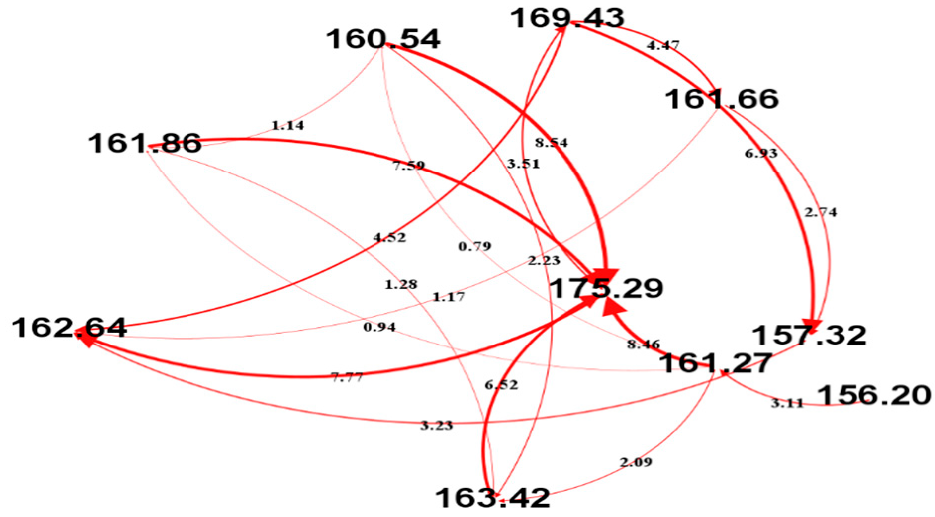 To illustrate the weighted CONECT graph, we selected 10 data points [156.20, 161.28, 160.55, 161.87, 163.43, 175.29, 169.43, 161.67, 157.32, 162.65] from the real EEG data. Then, the ARC rule is applied to this authentic data segment/points to obtain the directed edges. The weight of each edge is calculated using Equation (2). The resulting CONECT graph is visualized in