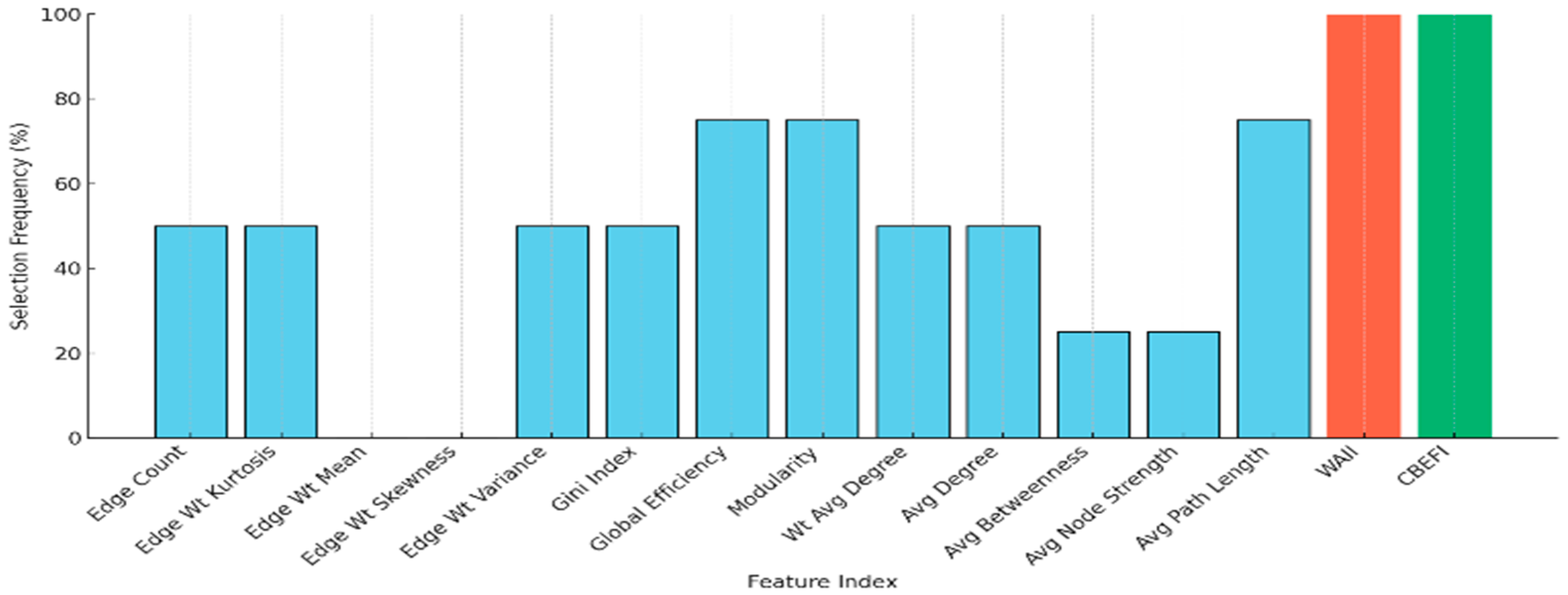 The high selection rate of WAII and CBEFI validates their ability to capture nuanced variations in EEG network topology that are often overlooked by classical descriptors. In contrast, several conventional features, such as average nodal strength and average path length, were selected in less than 30% of cases, suggesting limited standalone relevance in dementia classification.