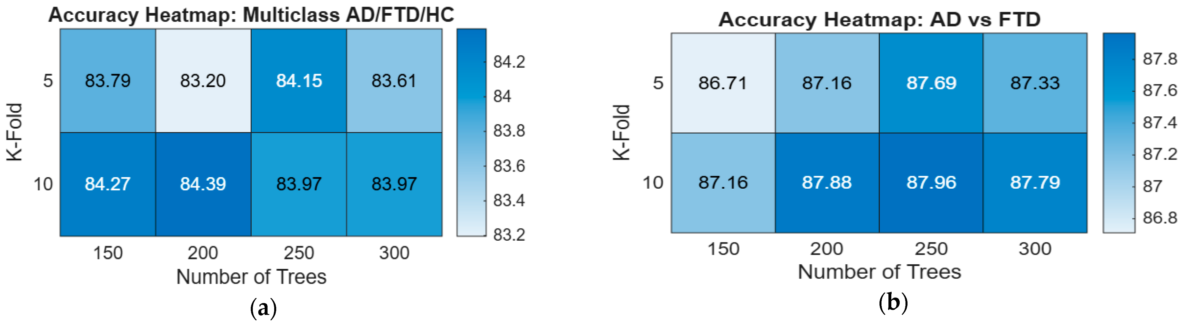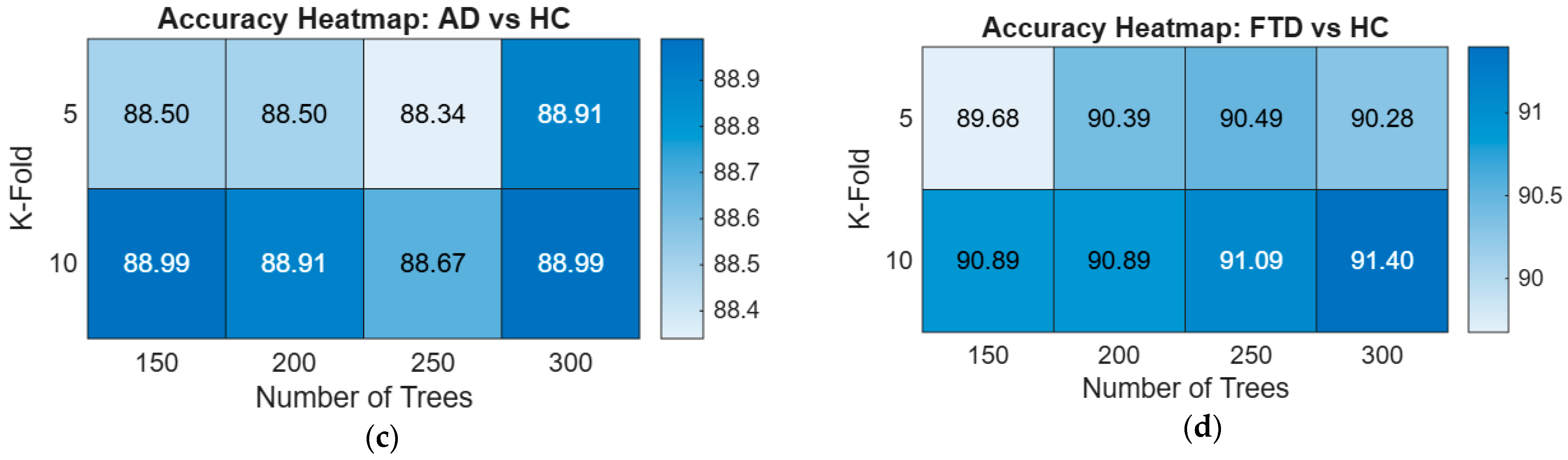 Figure 5 presents four heatmaps summarizing the impact of Random Forest hyperparameters: number of trees (150–300) and K-fold values (5-fold and 10-fold), across all classification tasks. The multiclass AD/FTD/HC experiment showed stable performance (83.20–84.39%), with the highest accuracy observed at 200 trees using 10-fold CV. In the binary classifications, accuracy consistently improved with 10-fold CV, reflecting enhanced robustness. For AD vs. FTD, the best performance (87.96%) occurred at 250 trees with 10-fold CV, while AD vs. HC produced uniformly strong results (88.34–88.99%).
