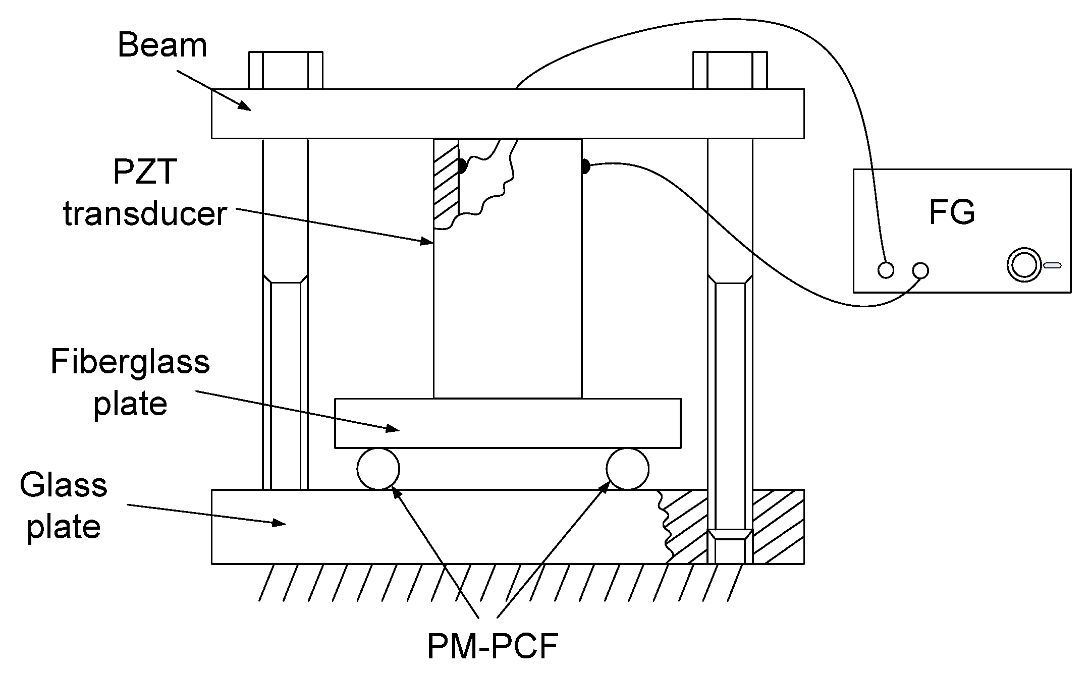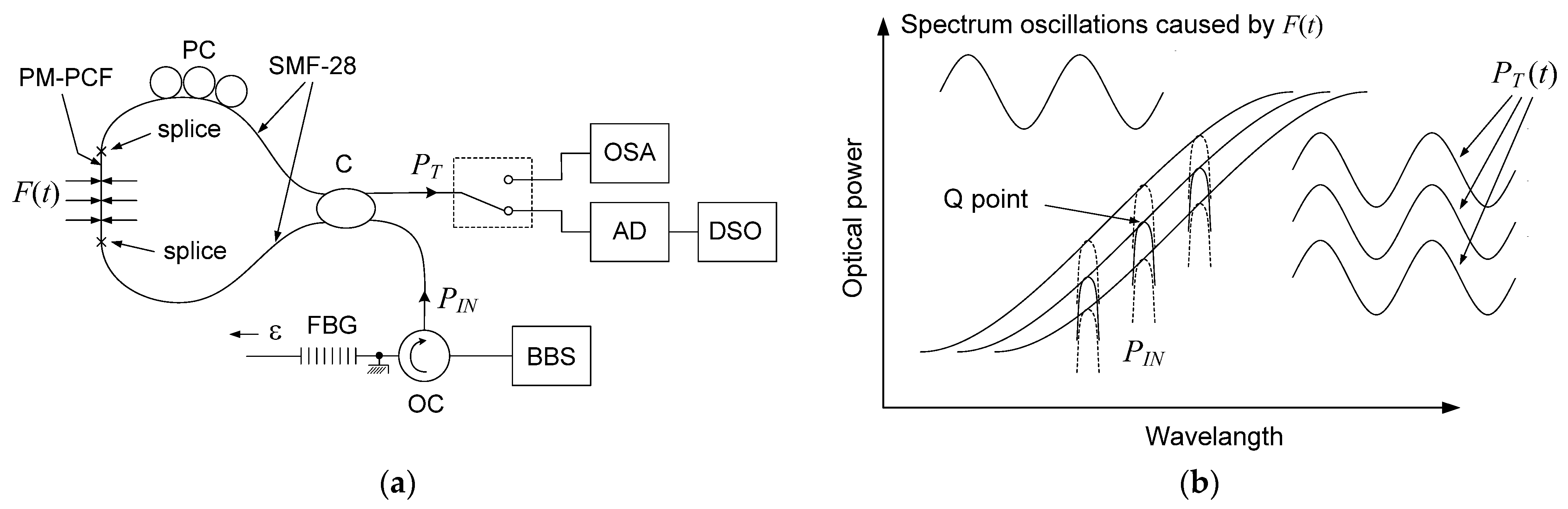 Figure 1b. A sinusoidally varying transverse force acting on the PM-PCF of the SLF causes synchronous shifts in its spectral transmission, which modulate the power of the grating’s reflected beam at the transmission output of the filter. The tensile strain of the FBG causes a shift in the spectrum of its reflected beam and, therefore, a change in the operating point of the SLF, which results in a change in the constant component of the power of this beam at the transmission output of the filter. To generate a variable transverse force acting on the PM-PCF, a piezoelectric transducer (PZT), model Pz27 from Meggitt A/S, was used, controlled by the voltage output from a function generator (FG), model JC5603P from NDN. The PZT was installed in compression mode, as shown in