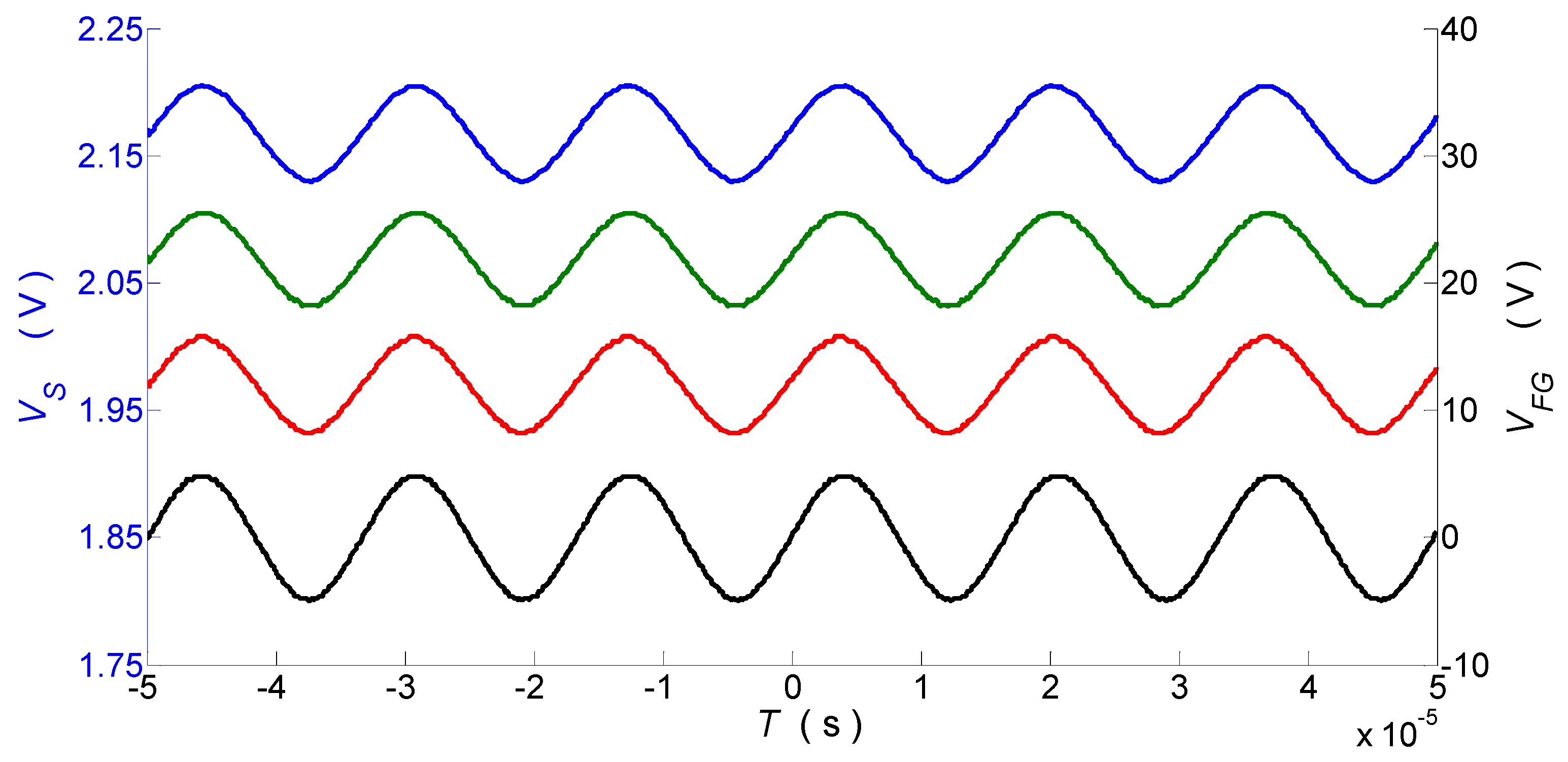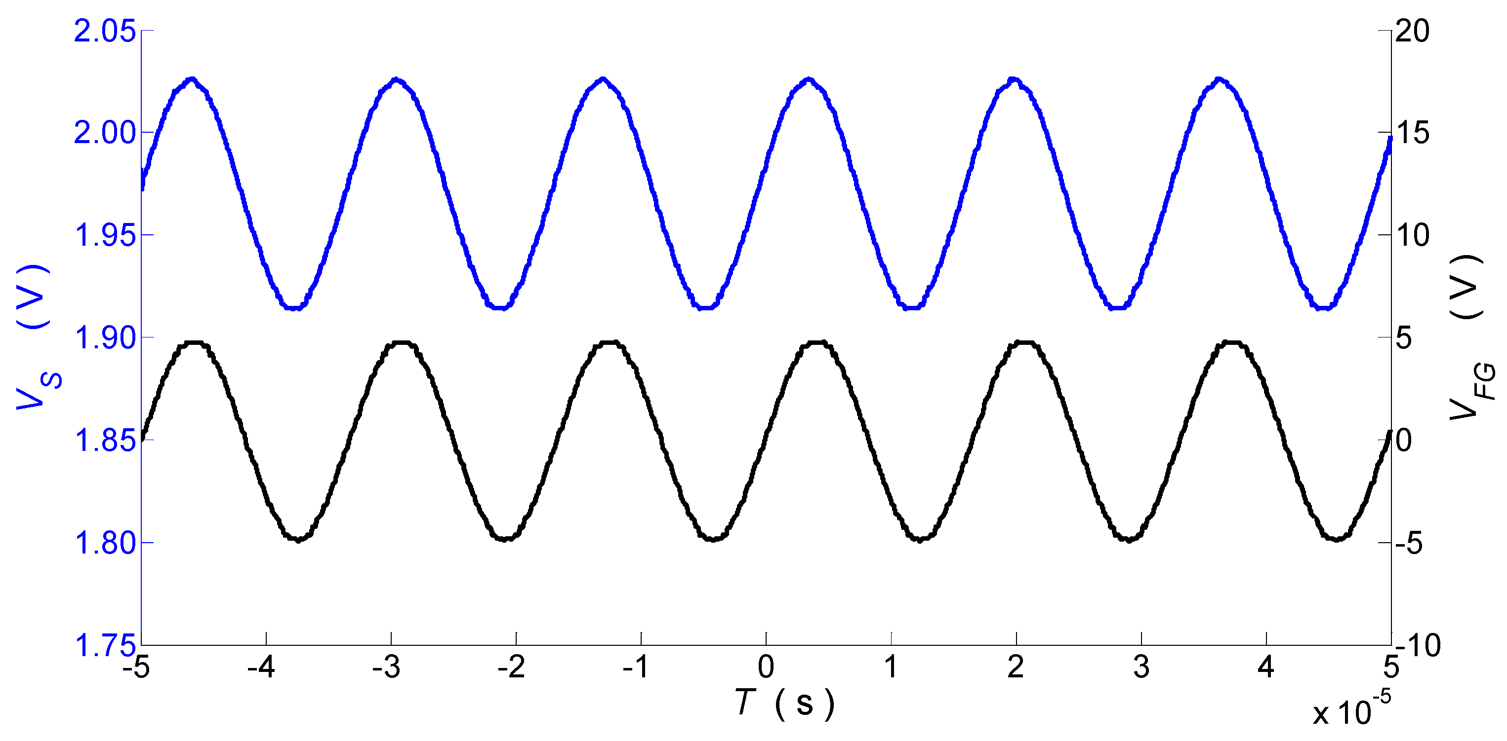 Figure 4 shows the time waveforms of the sensor’s output voltage and the FG’s output voltage controlling the piezoelectric transducer PZT, recorded by the DSO. The variable component of the sensor output voltage corresponds to a sinusoidally varying force with an amplitude of 1.5 N and has the same frequency as the PZT control signal. The observed phase shift between these waveforms is due to detuning from the PZT resonance.