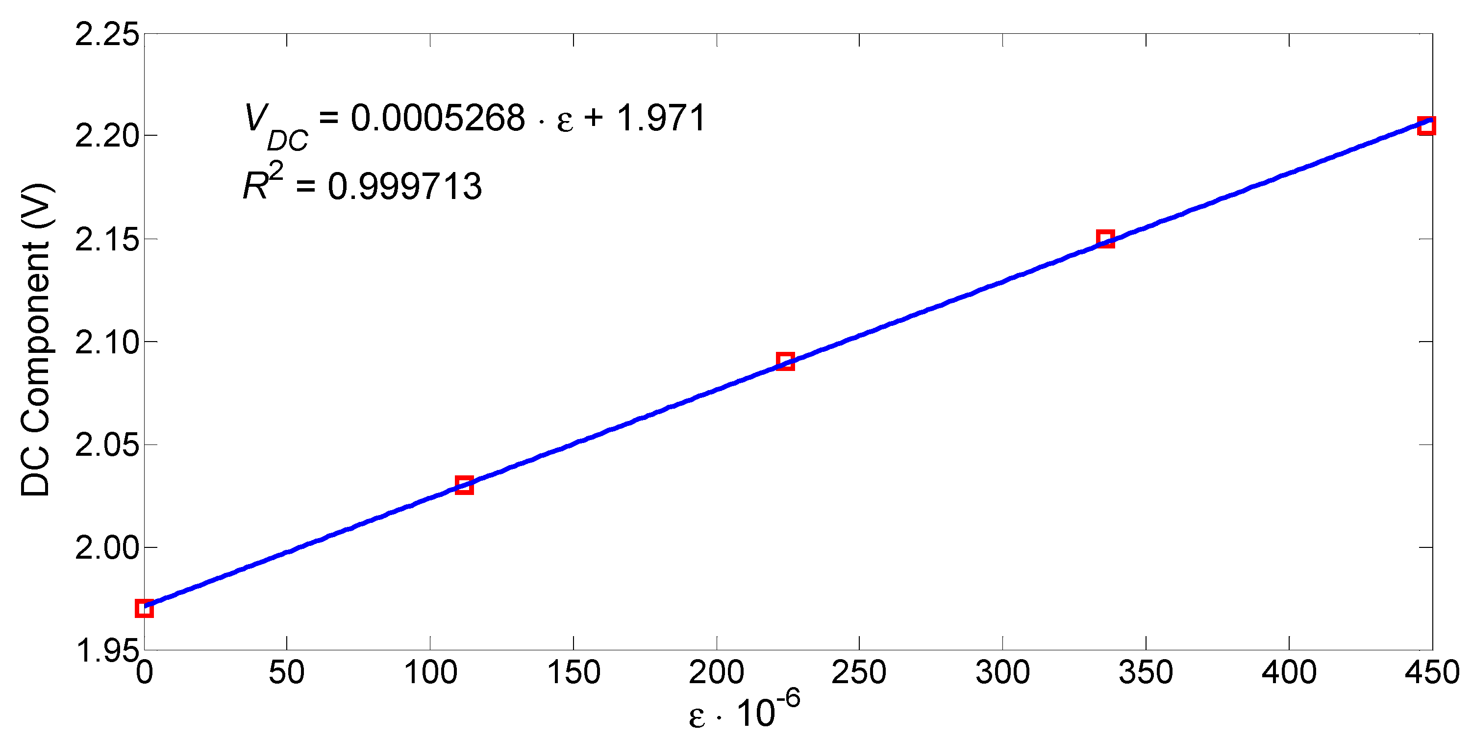 The constant component of the sensor output voltage as a function of the FBG strain is shown in