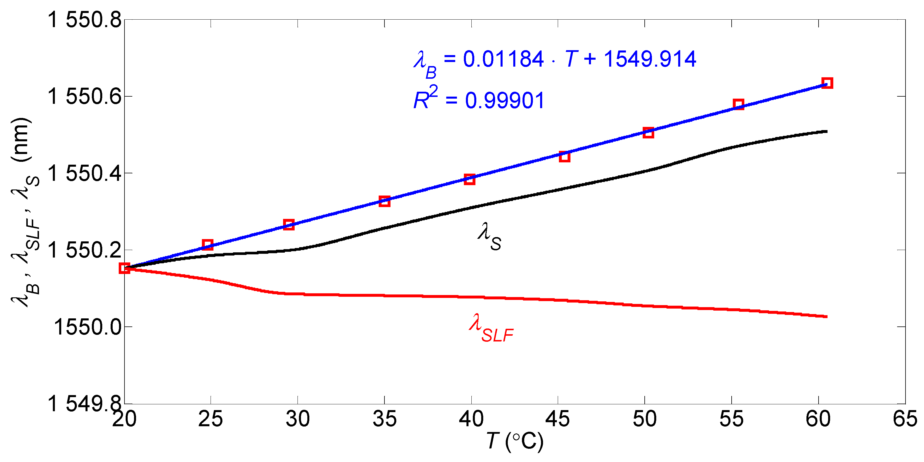 26]. Measurements of the effect of temperature changes in the range 20–60 °C on the central wavelength of the employed FBG with recoating were carried out, the results of which are graphically presented in