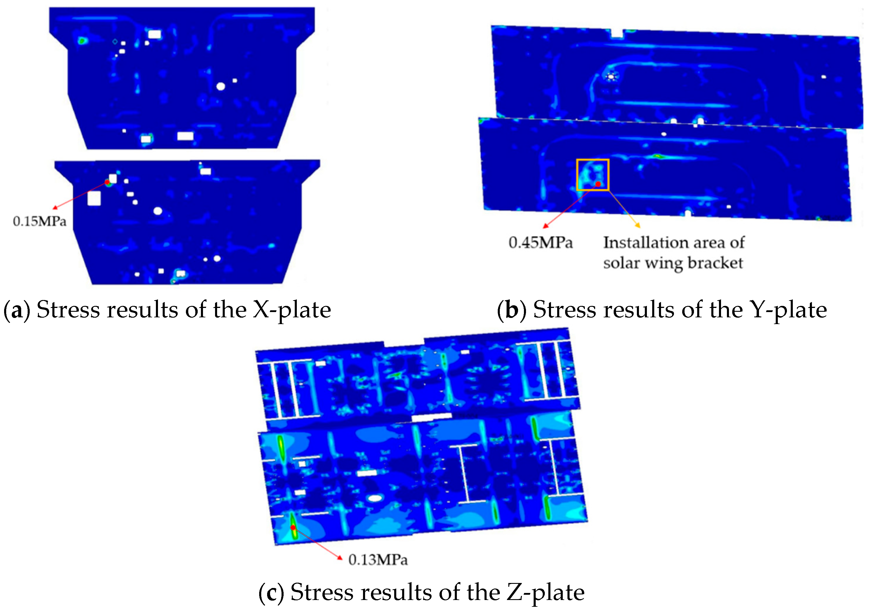 Along with the rapid development of aerospace technologies, to satisfy the need for in-orbit utilization, increasing load size, satellite size, mass, and the structure of satellite tends to be complicated. During the execution of evaluations and quality audits on larger satellites, noise test is required. The mechanical conditions of satellites during launch are relatively stringent, primarily for two reasons. One factor is the force conveyed through the docking interface of the satellite and rocket, including the relatively stable mechanical conditions produced by engine thrust and the transient mechanical conditions resulting from rocket engine ignition, stage separation, etc. The second factor pertains to the mechanical conditions directly affecting the satellite’s surface caused by the noise environment within the fairing, which must be considered in the satellite design process due to its impact on the satellite structure. Considering all of the above factors, it is essential to analyze the response and stress of large satellites subject to acoustic excitation. In previous research, there have been many studies on the response analysis of thin-walled structures subjected to noise excitation. The stress analysis and structural strength verification of satellites subjected to acoustic excitation remain essential in the design of large satellite structures and require particular attention.