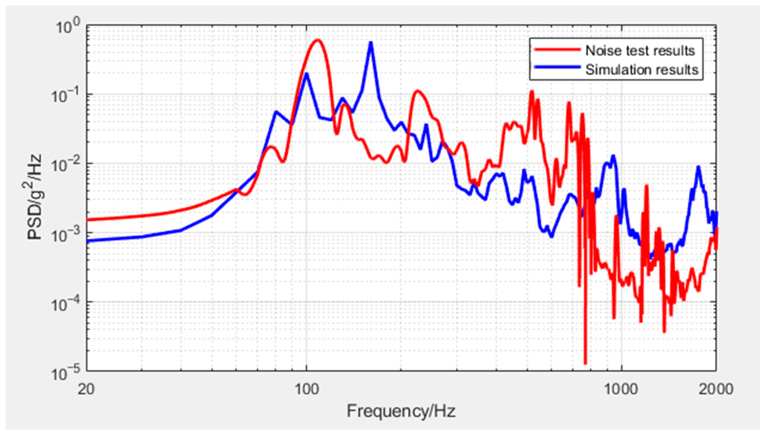 The paper establishes a finite element simulation model using an equivalent honeycomb model and empirical damping model, transforming the sound pressure spectrum into pressure power spectral density, converting noise excitation into random excitation, and implementing it on the surface of the satellite finite element model. A variable damping model instead of fixed value damping is adopted; the response and stress results subjected to noise excitation are analyzed and tested.