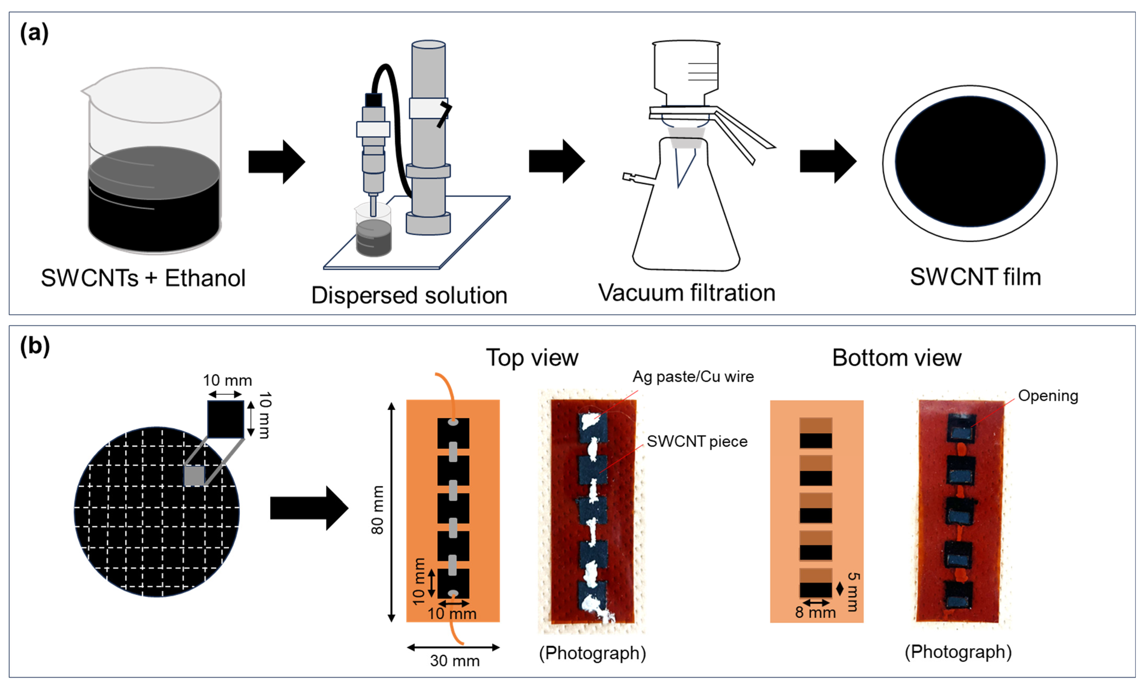 - Yamamoto, H.; Amezawa, T.; Okano, Y.; Hoshino, K.; Ochiai, S.; Sunaga, K.; Miyake, S.; Takashiri, M. High thermal durability and thermoelectric performance with ultra-low thermal conductivity in n-type single-walled carbon nanotube films by controlling dopant concentration with cationic surfactant. Appl. Phys. Lett. 2025, 126, 063902. [Google Scholar] [CrossRef]