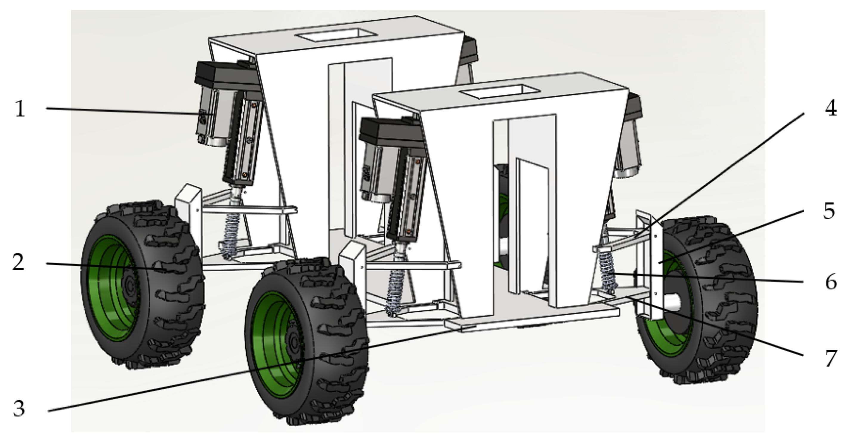 - Liu, P.; Peng, F.; Li, H.; Wang, Z.; Wei, W.; Zhao, J. Design and Experiment of Adaptive Leveling Chassis for Hilly Area. Trans. Chin. Soc. Agric. Mach. 2017, 48, 42–47. Available online: https://www.nyjxxb.net/index.php/journal/article/view/465 (accessed on 3 December 2025).