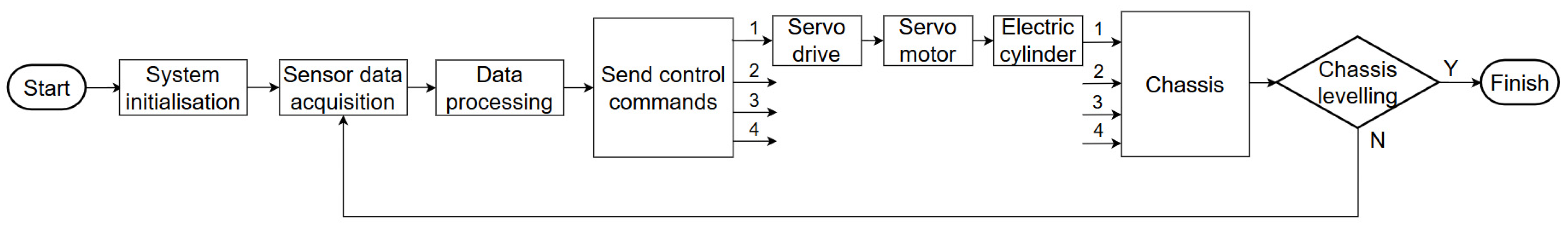 - Jia, X.; Shi, Z.; Li, R.; Zhang, G.; Geng, D.; Lan, Y.; Wang, B. Design and Test of Automatic Leveling System for Chassis of SmallAgricultural Machinery in Hilly and Mountainous Areas. Trans. Chin. Soc. Agric. Mach. 2024, 55, 108–115. [Google Scholar] [CrossRef]
