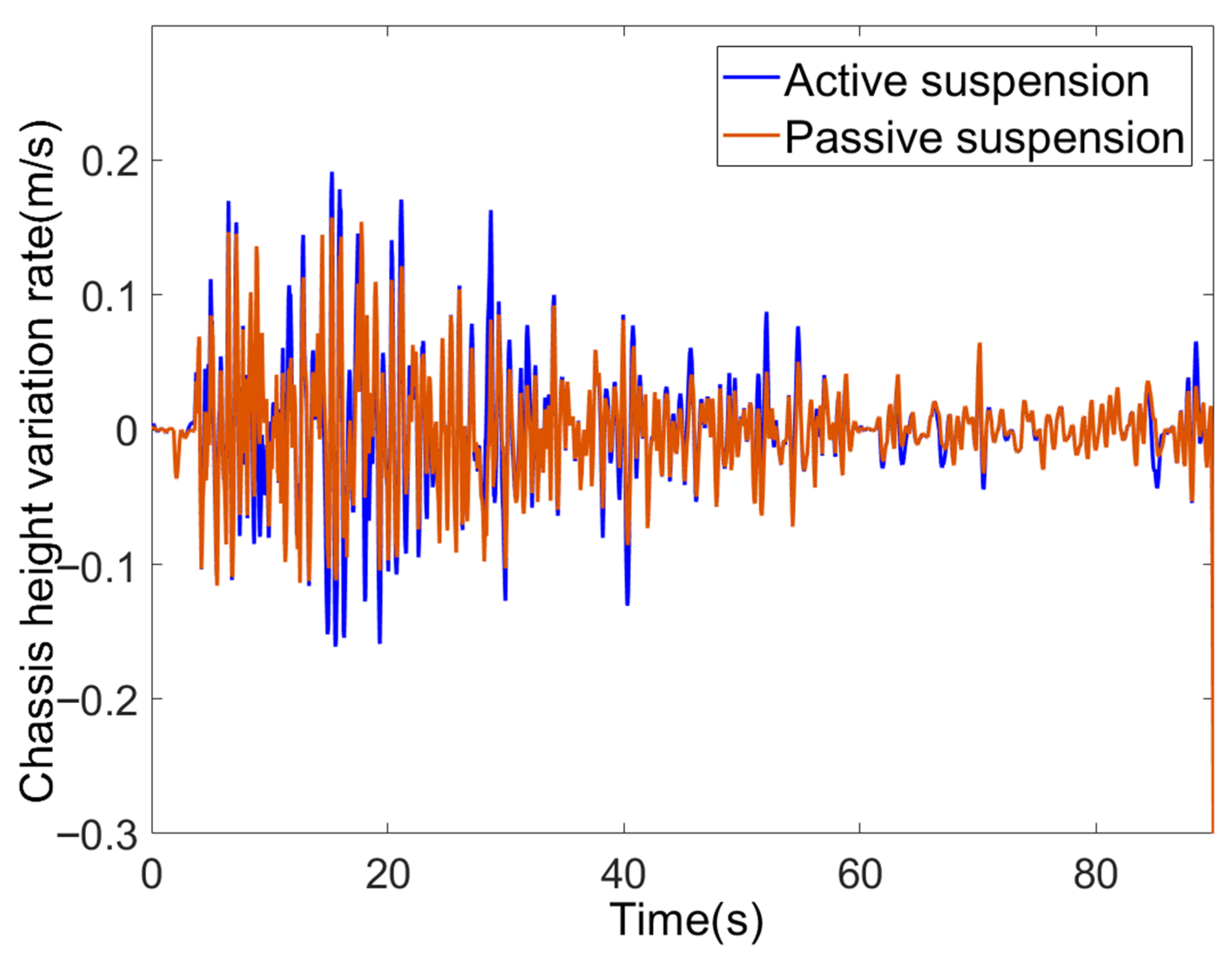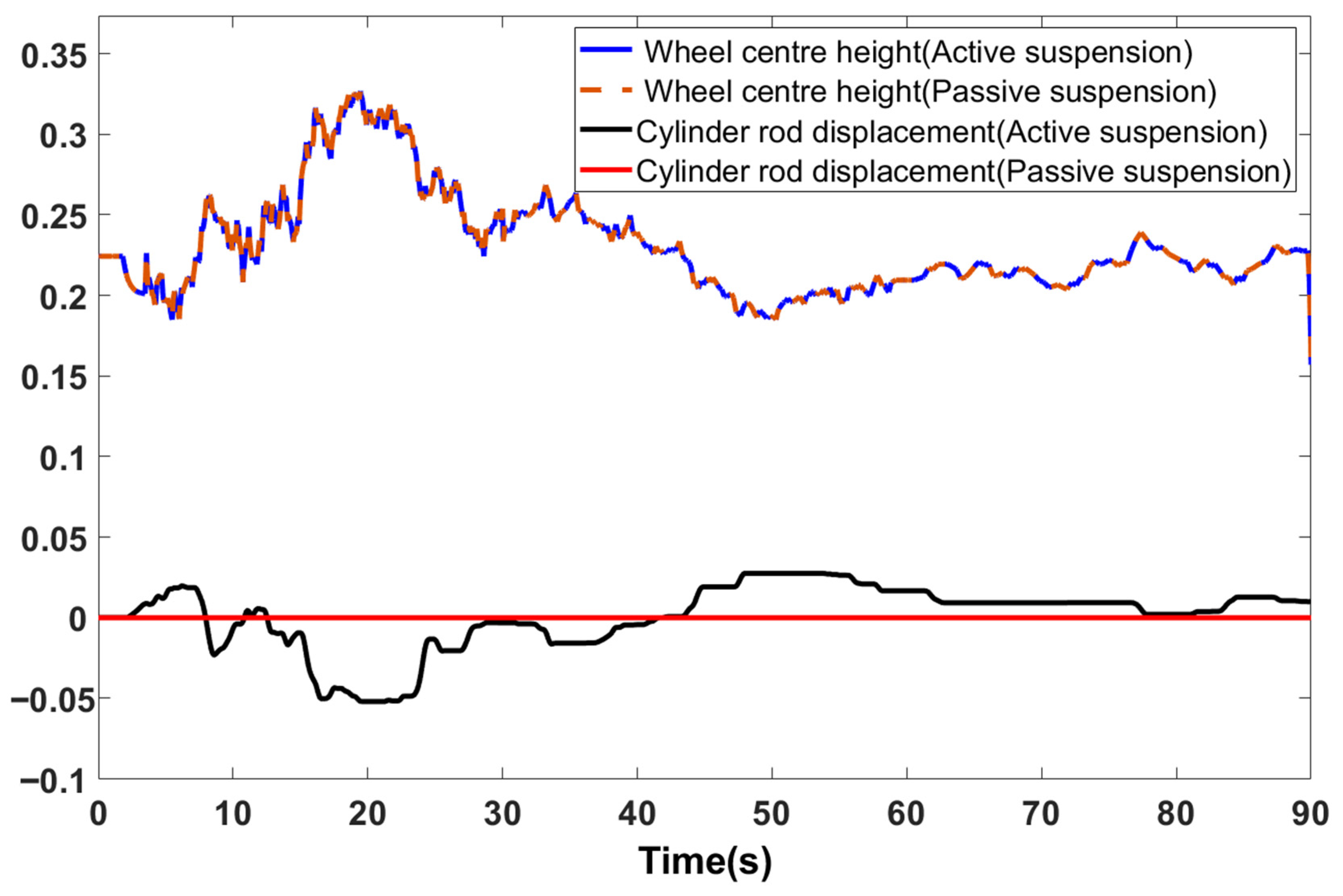 - A comparative simulation experiment was conducted between a passive suspension and an active suspension. The simulation results demonstrated that the active levelling system based on fuzzy PID control strictly confined the actual chassis height deviation to within ±0.05 m when traversing random road surfaces, representing a significant improvement in chassis stability compared to the passive suspension. The chassis height variation rate remained within ±0.2 m/s, demonstrating the shock absorption capabilities of the spring and damping components. The electric cylinder response time was ≤0.8 s, exhibiting rapid responsiveness.