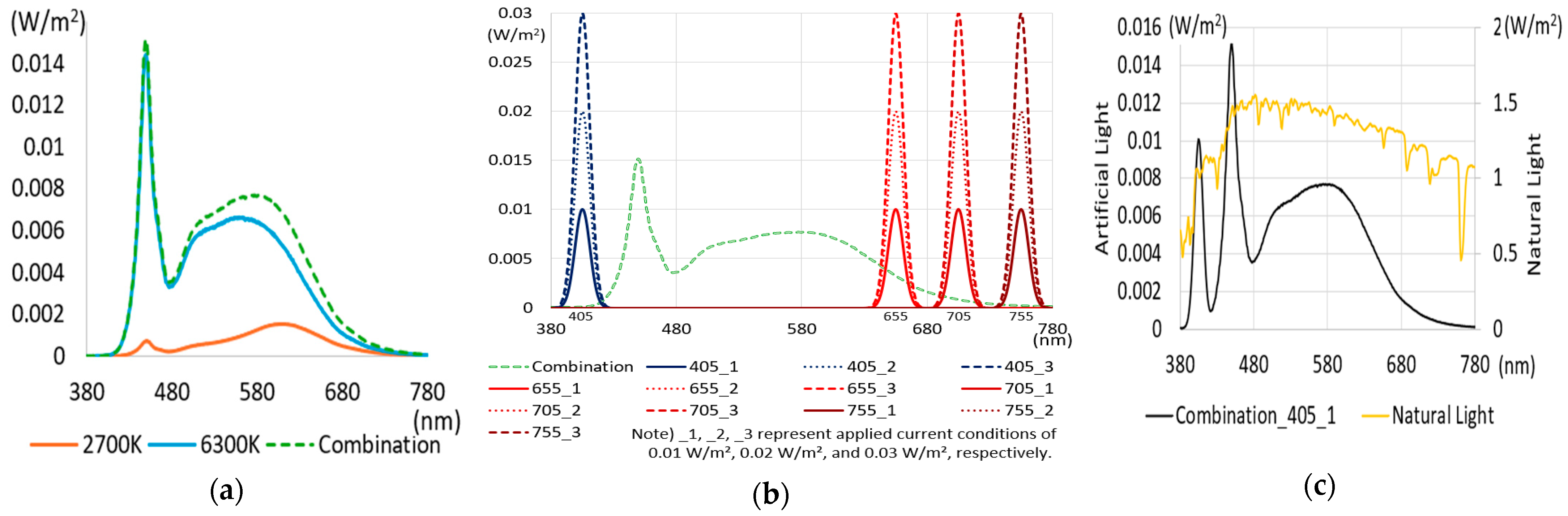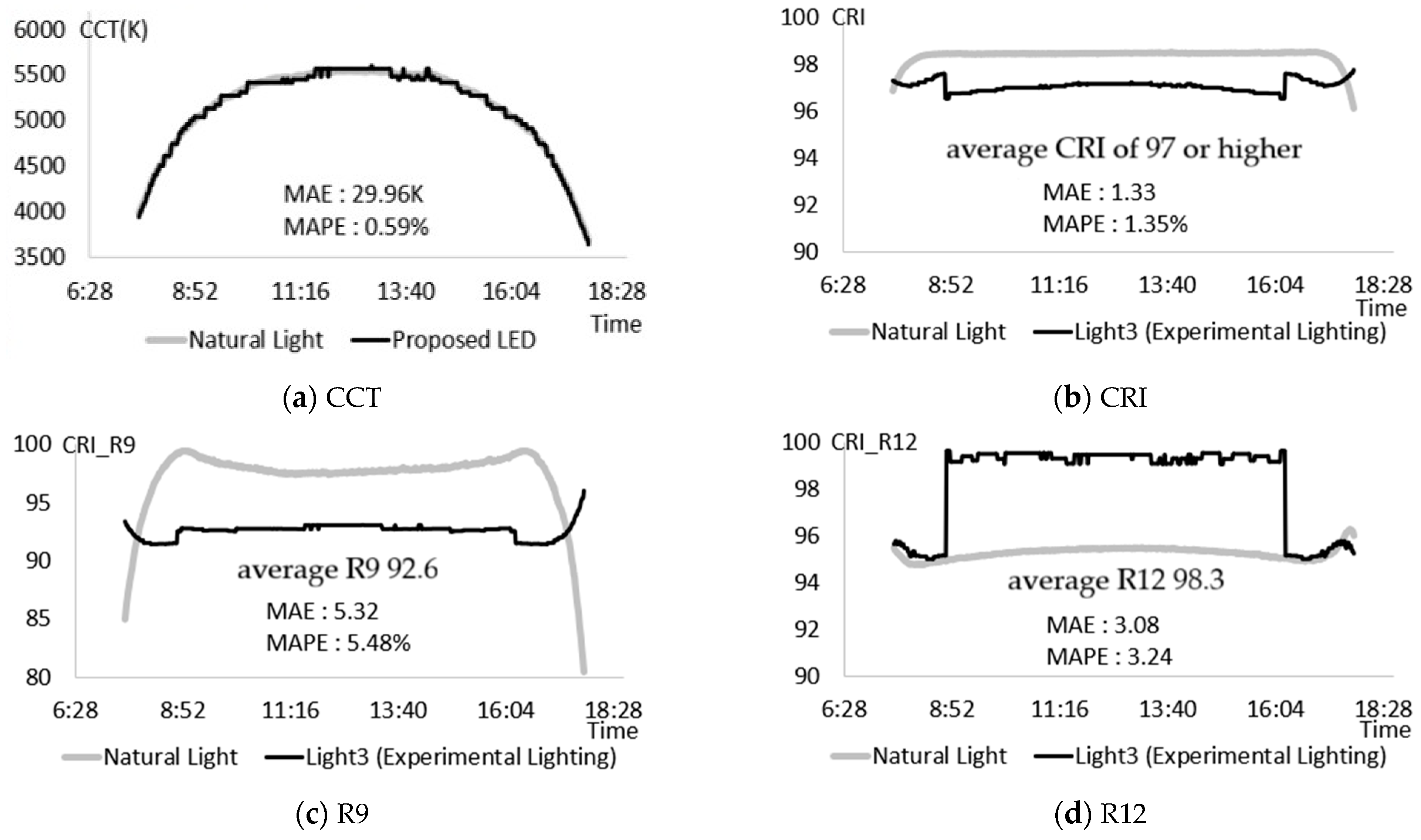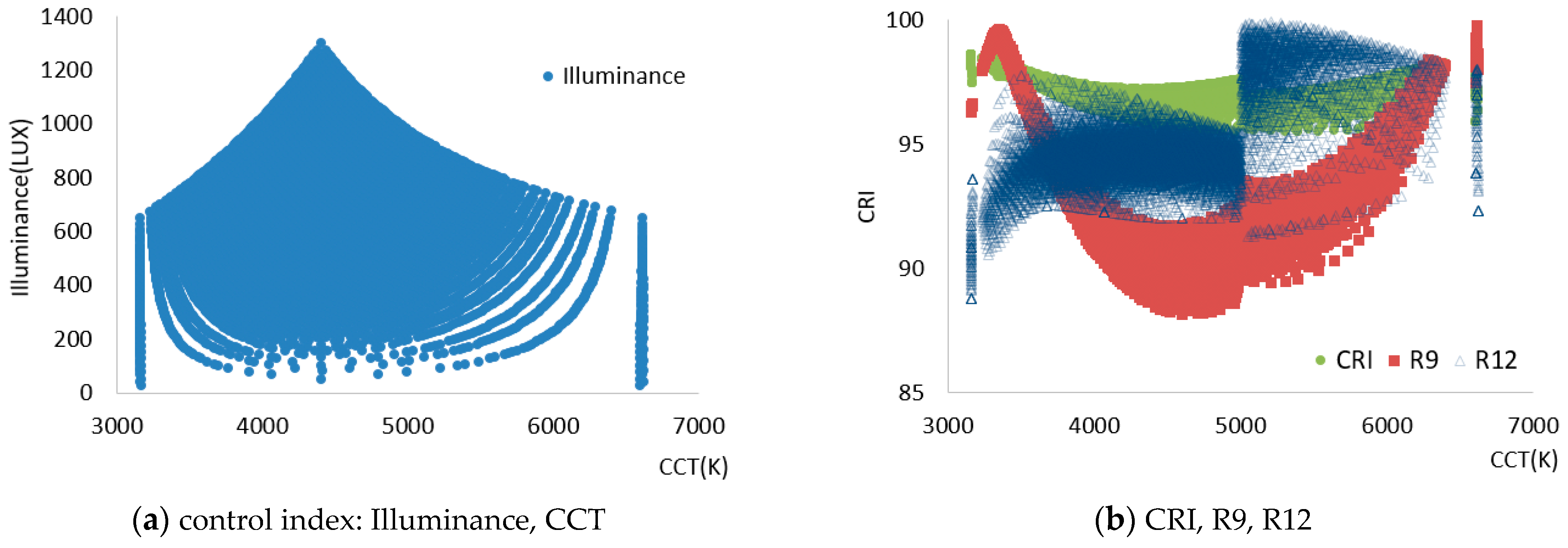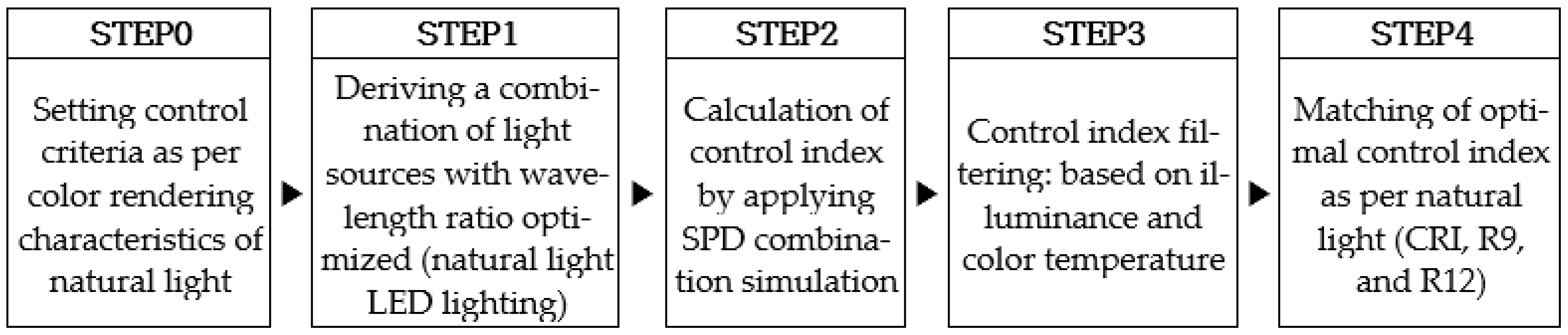 - Oh, S.-T.; Lim, J.-H. CRI-Based Smart Lighting System That Provides Characteristics of Natural Light. Information 2023, 14, 628. [Google Scholar] [CrossRef]