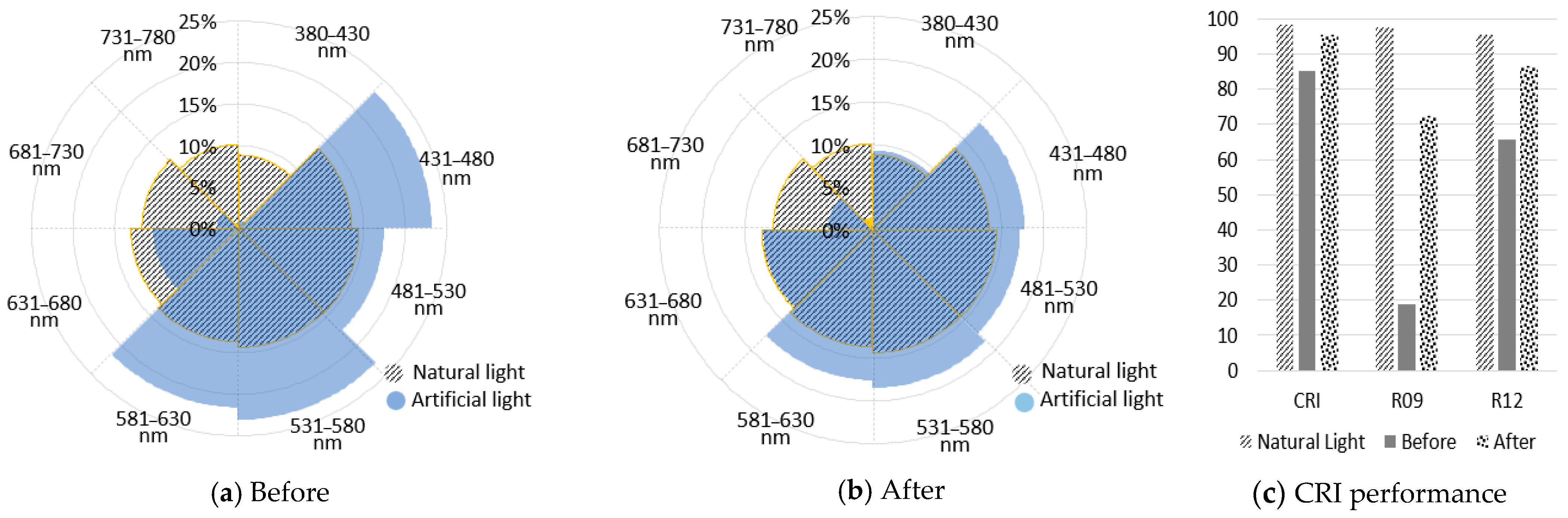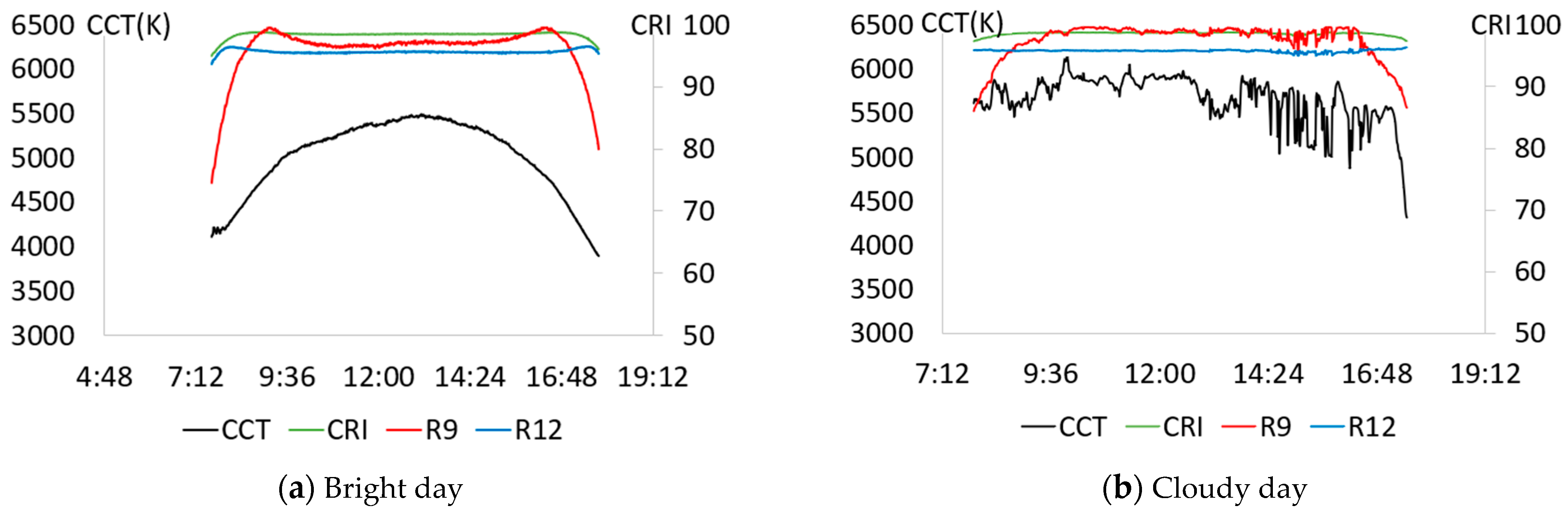 - Lee, J.Y.; Oh, S.T.; Lim, J.H. Exhibition Hall lighting design that fulfill high CRI based on natural light characteristics-focusing on CRI Ra, R9, R12. J. Internet Comput. Serv. 2024, 25, 65–72. [Google Scholar]