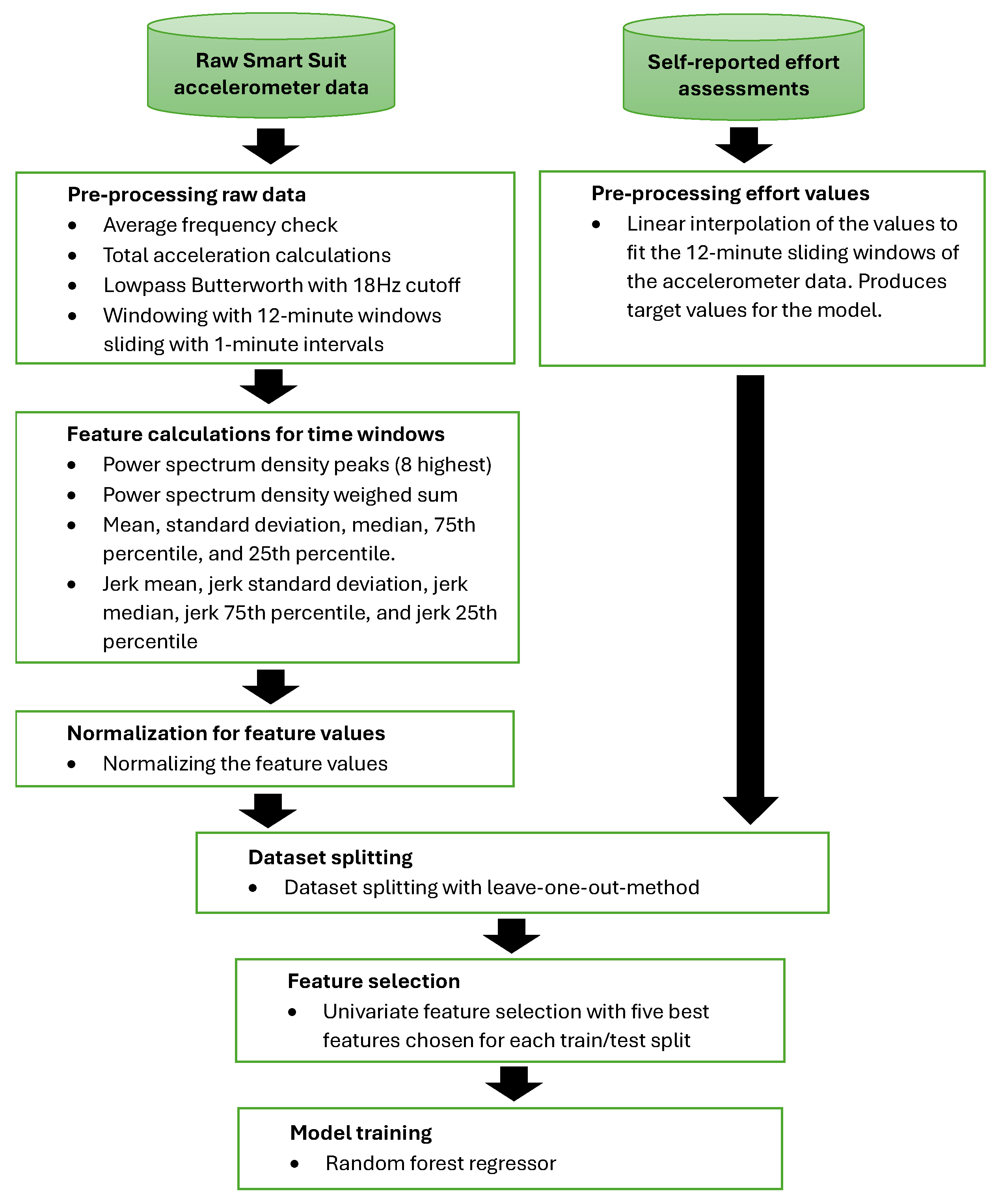 Other features that were calculated can be divided into standard features and jerk features. Standard features are common features used in machine learning, including mean, standard deviation, median, 75th percentile, and 25th percentile. These features are calculated directly for the windowed total acceleration values. Jerk features are otherwise the same, except the total acceleration windowsare first used to calculate the jerk value, i.e., derivative/gradient of the aforementioned time window. These jerk time windows are then used to calculate the machine-learning features of mean, standard deviation, median, 75th percentile, and 25th percentile. Calculating all these features for all the 6 different sensors resulted in a total of 114 different features being used in the feature selection phase. After feature calculations, the features were normalized by dividing each feature value with the average of the first two values of each feature vector. The normalization is needed to create features that are comparable between different test subjects and to be able to create a generalized fatigue model from many sources. Different data standardization approaches were tried, such as setting the dataset mean to zero and standard deviation to 1 (standard scaling), and by scaling each feature to a given value range (from 0 to 1), but the normalization with the equation below yielded the best results.