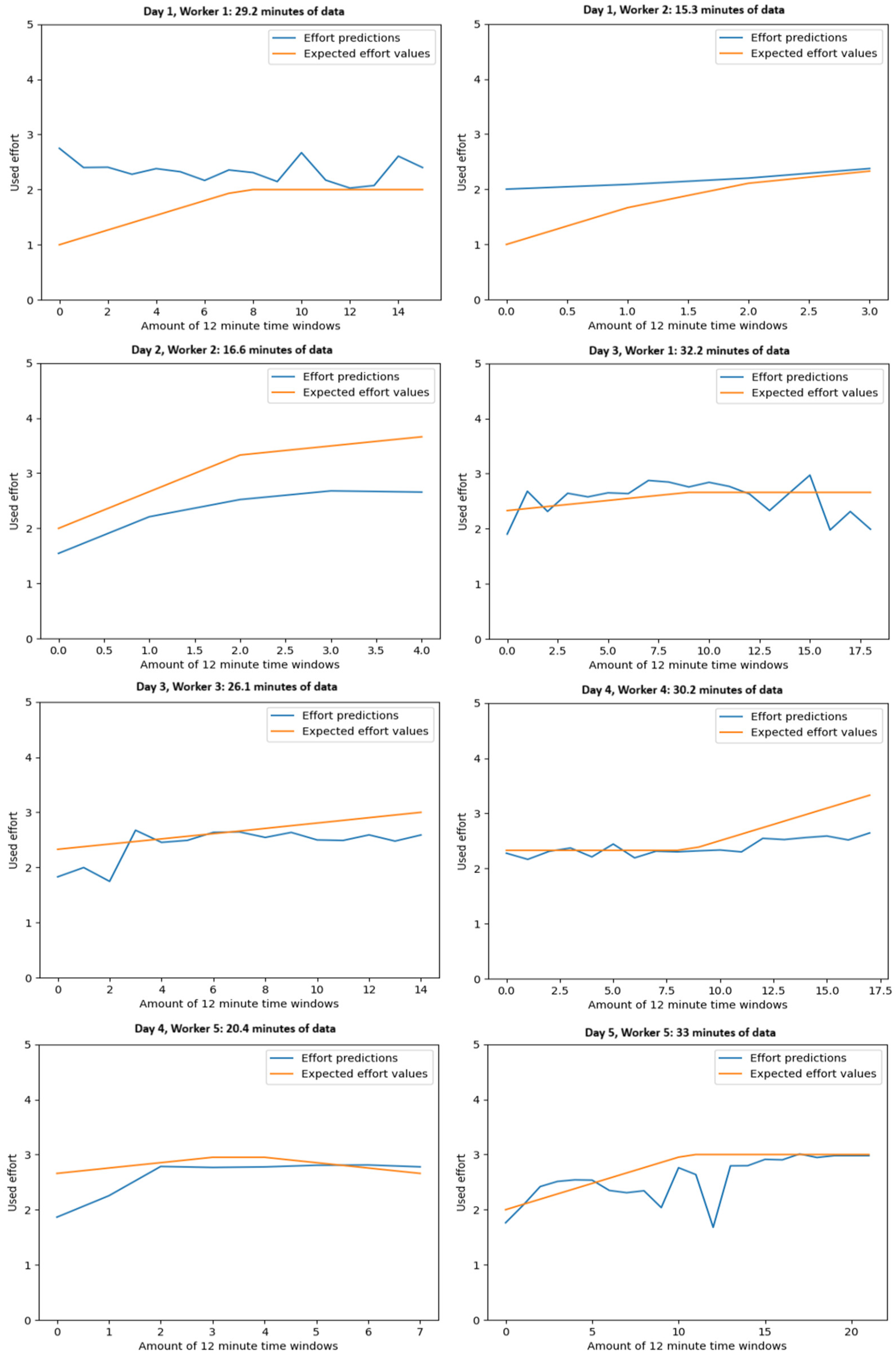Figure 3 depicts all the effort trends predicted by the fatigue model (using all possible features), and the linearly interpolated actual expected values. The fatigue trend detection is well in line with the expected effort values (effort self-assessment collected from workers).