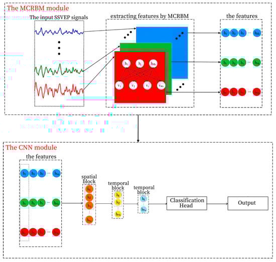 Recently, deep learning has achieved remarkable results in different fields, such as computer vision and speech recognition, and has been gradually introduced into EEG signal processing tasks [4]. Compared with traditional methods, deep learning can automatically learn the latent structure of data and directly extract discriminative high-level features from the original signals, thereby reducing manual intervention and dependence on domain knowledge, and improving classification accuracy. In SSVEP classification, a convolutional neural network (CNN) demonstrates outstanding capabilities for feature extraction and pattern recognition, which can extract local and global temporal–spatial features through multi-layer convolution, and has become a research hotspot [5]. In parallel, generative models, like the restricted Boltzmann machine (RBM), offer a powerful framework for unsupervised feature learning. Their multi-channel extension, the multi-channel RBM (MCRBM), is especially promising for EEG, as it can explicitly model inter-channel dependencies to uncover richer latent representations [6]. Li et al. [7] designed a spatial–temporal discriminative RBM for single-trial event-related potential (ERP) detection, which jointly captures robust spatial and temporal features and achieves a state-of-the-art performance. Despite these individual strengths, a synergistic integration of MCRBM and CNN for SSVEP classification remains largely unexplored. The current literature lacks comprehensive studies that effectively combine the robust, unsupervised feature learning of MCRBM with the superior discriminative power of CNNs, leaving a gap in both model architecture design and parameter optimization guidance.