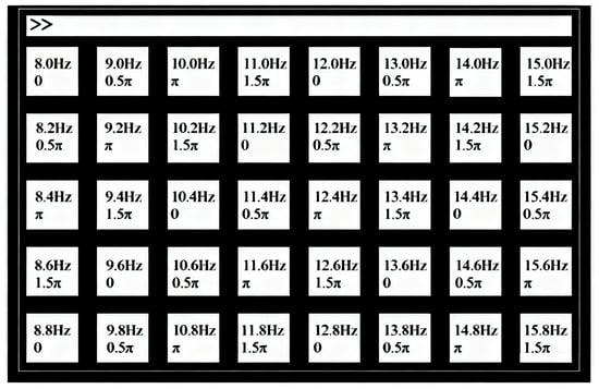 (1) Dataset I: The benchmark dataset introduced by Wang et al. [28] comprises SSVEP recordings from 35 healthy subjects focusing on 40 visual stimuli. The subjects were asked to shift their gaze to the target as soon as possible, and were instructed to avoid eye blinks during the stimulation duration. These targets adopt a frequency-phase hybrid coding method, specifically including 40 frequencies (8.0 Hz to 15.8 Hz, with a step size of 0.2 Hz) and 4 phases (0, , , ). As shown in Figure 3, all the targets are arranged in a matrix layout.