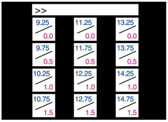 (2) Dataset II: The dataset provided by Nakanishi et al. [26] contains 12-class SSVEP data from 10 subjects, recorded in a simulated online BCI experiment. The 12 targets were arranged in a matrix and were distinguished using a combination of frequency and phase encoding. The visual stimulus editing interface is shown in Figure 4.