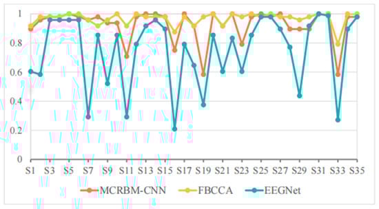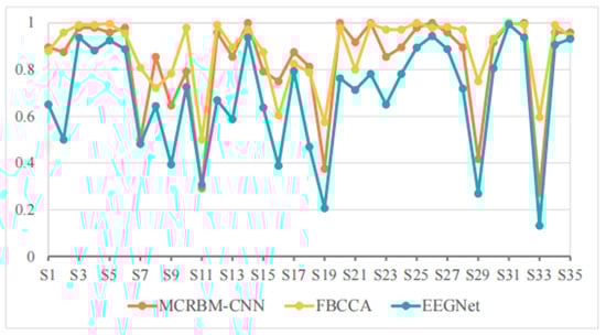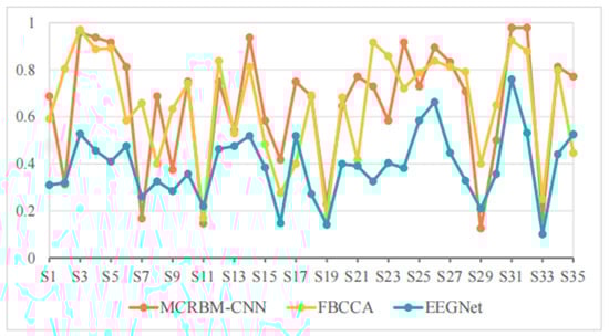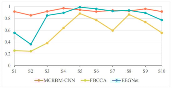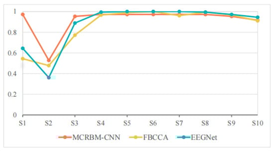 For the subjects S3 to S10, the accuracies of the three models maintained at a high level, especially EEGNet, which was almost saturated in some subjects. MCRBM–CNN also performed stably, basically maintaining a similar performance to a window length of 4 s. Although FBCCA performed well for most subjects, the accuracy for S3 decreased significantly.
