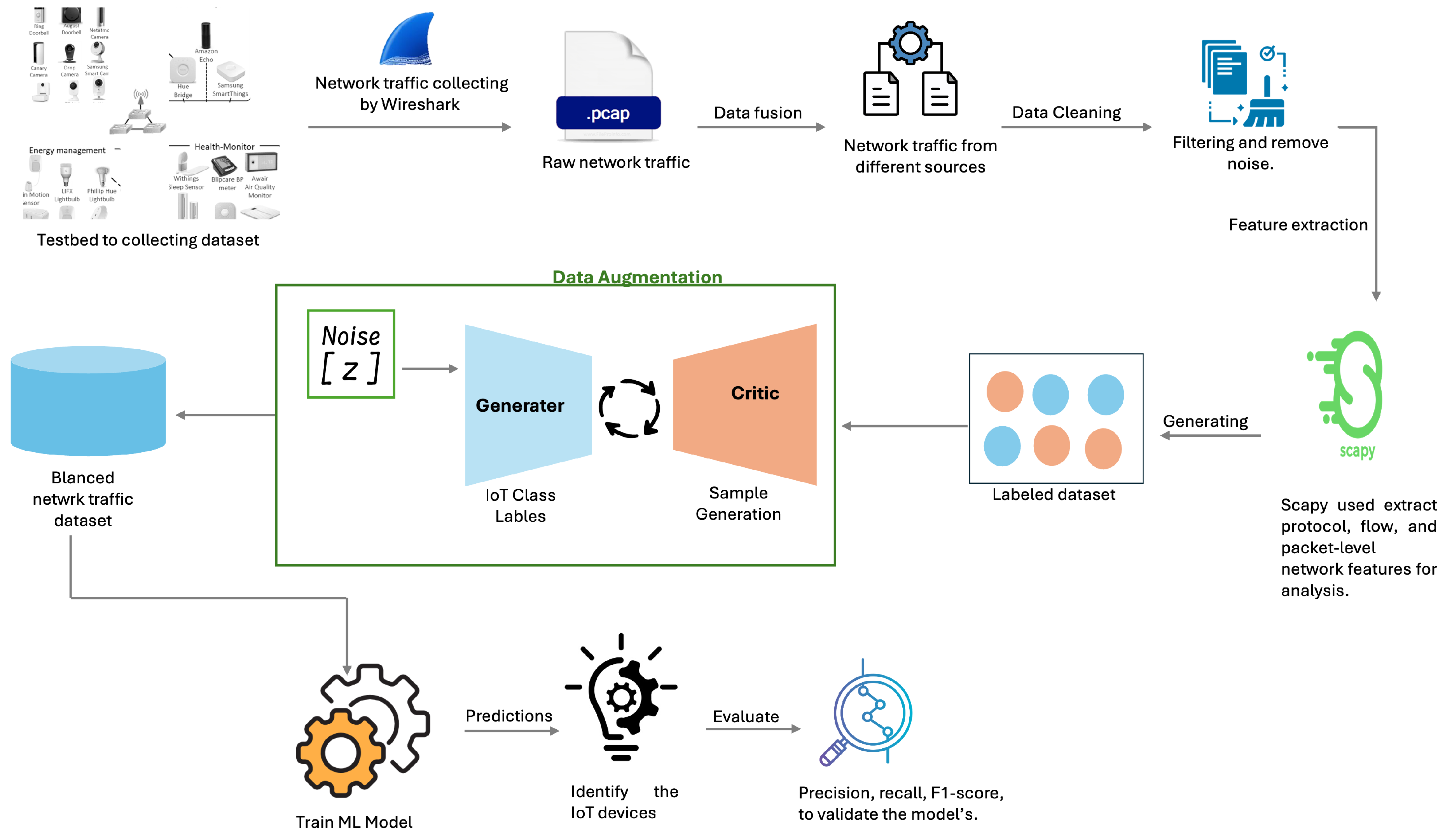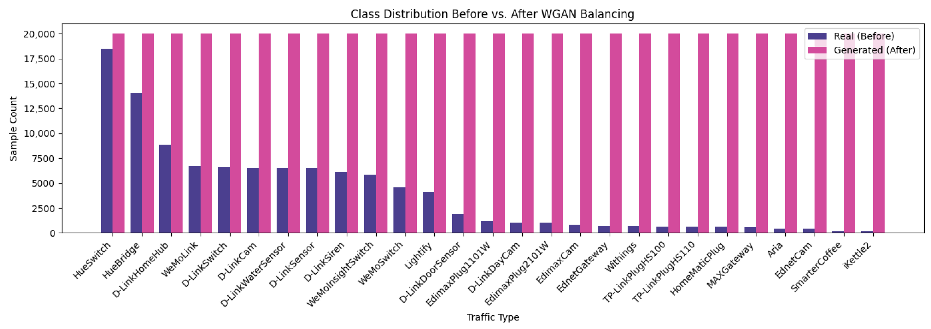 After this initial split, we employed the WGAN-generated samples to balance the label distribution within each subset. For every device class in the training, validation, and test sets, synthetic flows were added up to a fixed per-class target so that all the classes are represented with (approximately) equal frequency. This procedure has three benefits: (i) each subset contains a mixture of genuine and generated traffic for every device type; (ii) the class distribution within each subset is effectively balanced; and (iii) the separation between training, validation, and test sets is preserved, preventing information leakage. The balanced training and validation subsets are then used to fit and tune the machine learning models, while the balanced test subset is used exclusively for final performance evaluation.