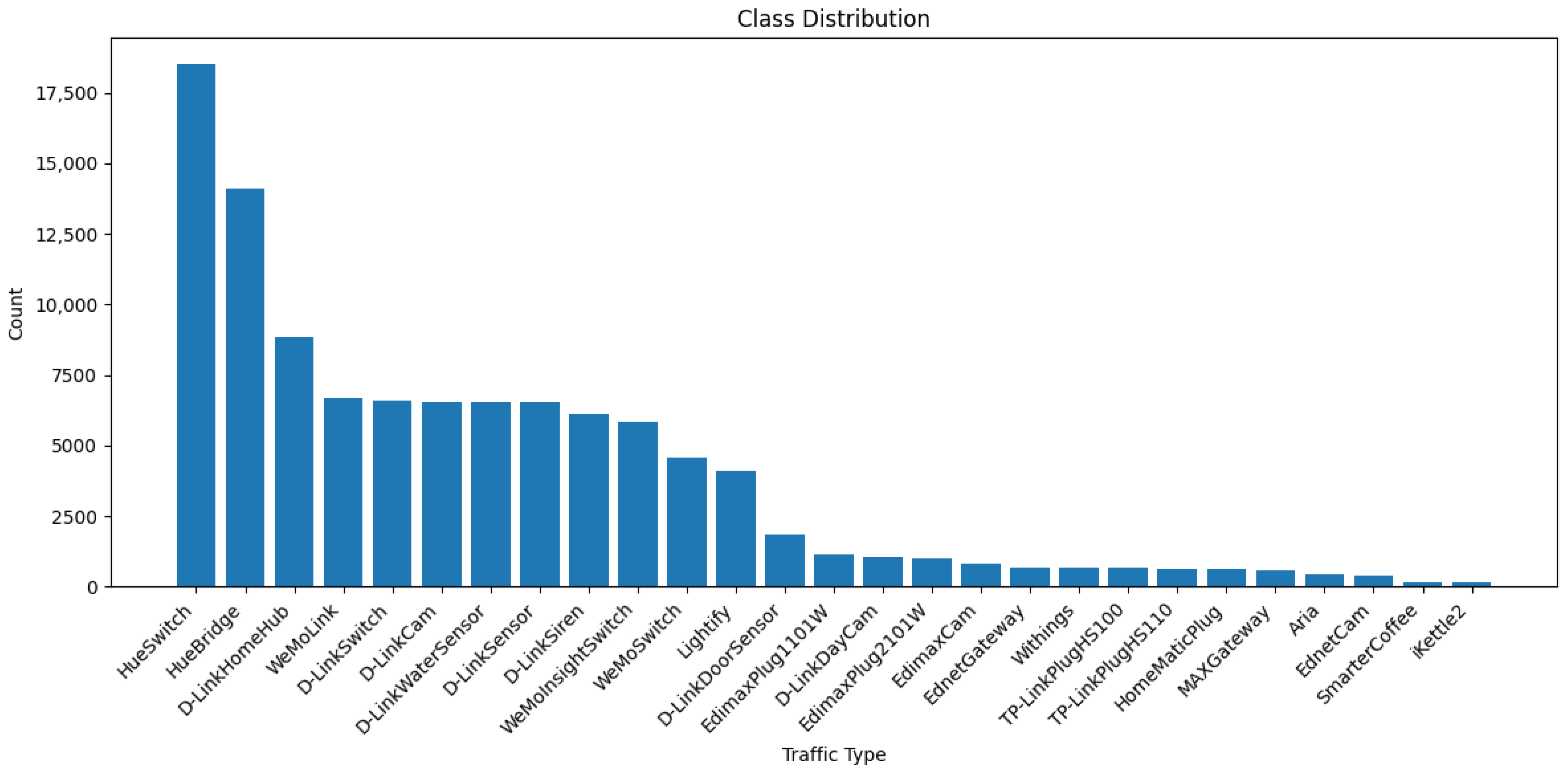 12]. In addition, class imbalance is a well-recognized challenge in IoT device identification: traffic from popular or always on devices (such as cameras or hubs) heavily dominates that of less frequently active or niche devices (such as specific sensors or appliances). This skewed distribution biases classifiers toward majority device types and leads to poor generalization and low identification accuracy for minority devices, even though these rare devices may be operationally important [
