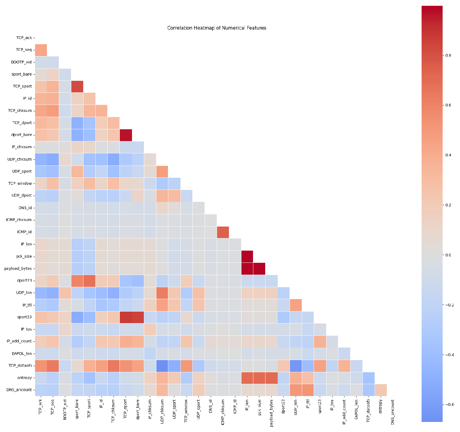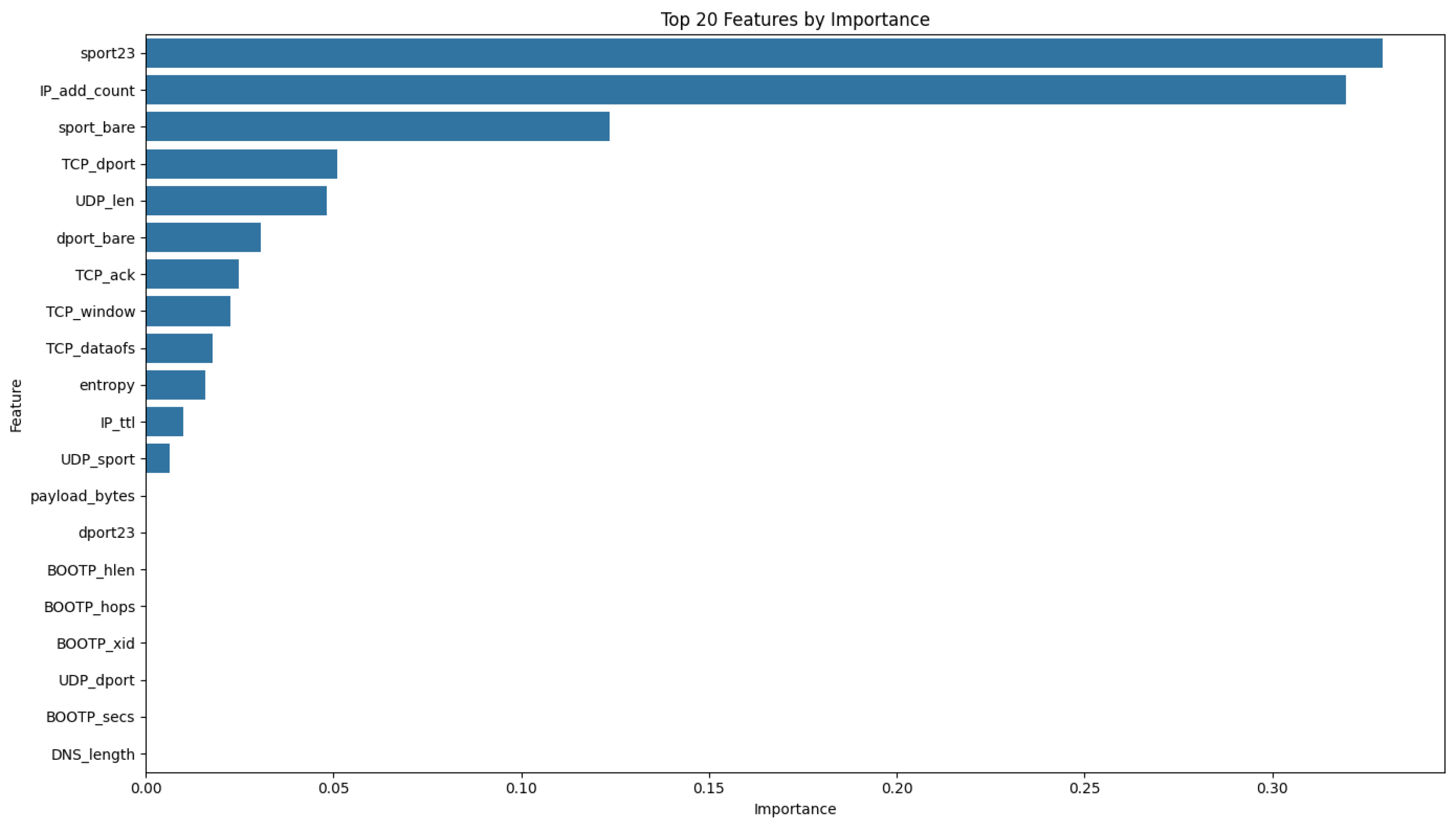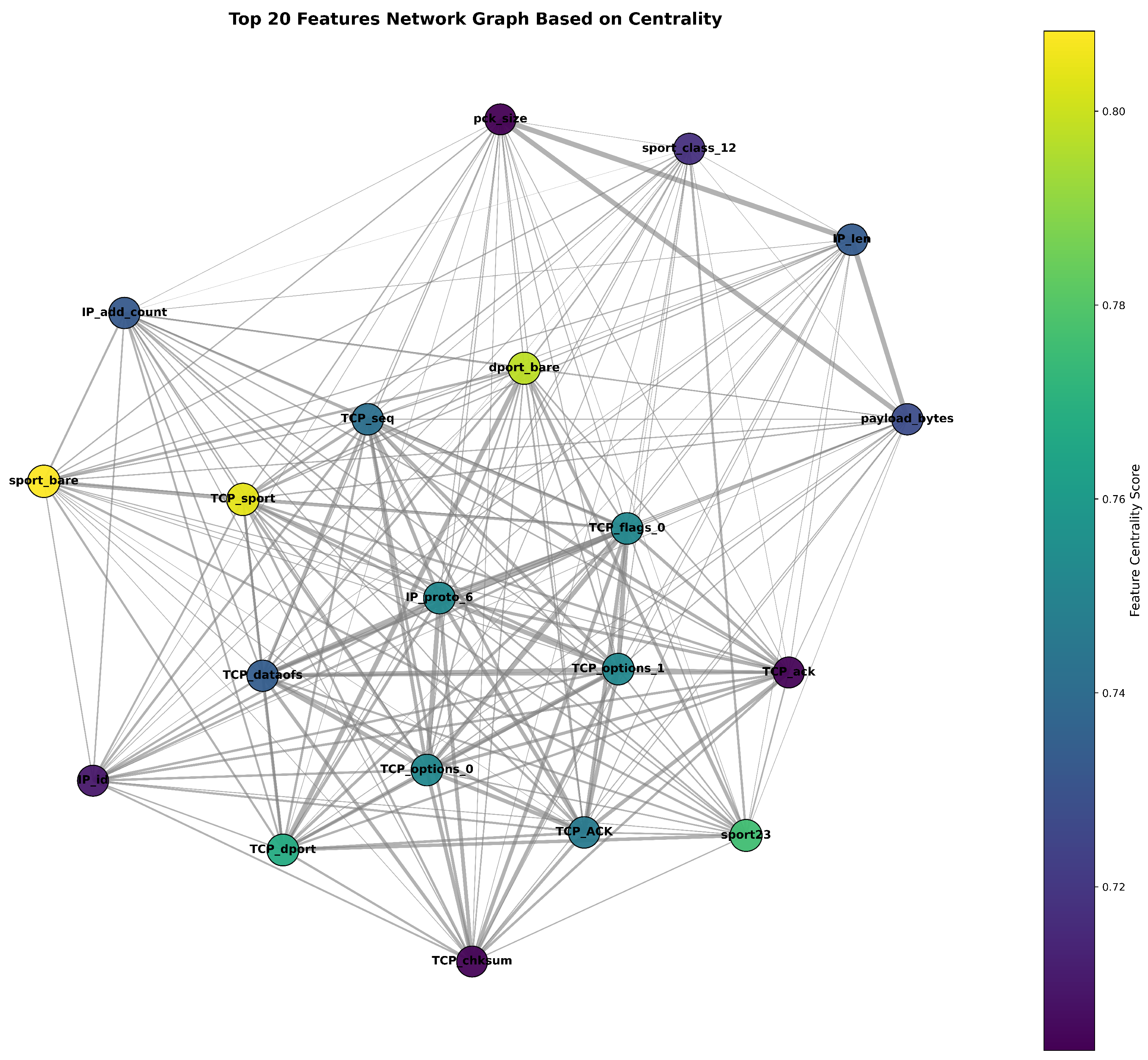 Figure 6 shows the 20 main central features extracted from our IoT traffic dataset, where node size and color intensity encode the combined centrality score of each feature, and the edge thickness reflects the strength of pairwise correlations. The topology not only reveals which features are most influential and tightly coupled but also guides our feature selection: we prioritize nodes with both high centrality and strong inter-feature correlations to construct more robust classification models.
