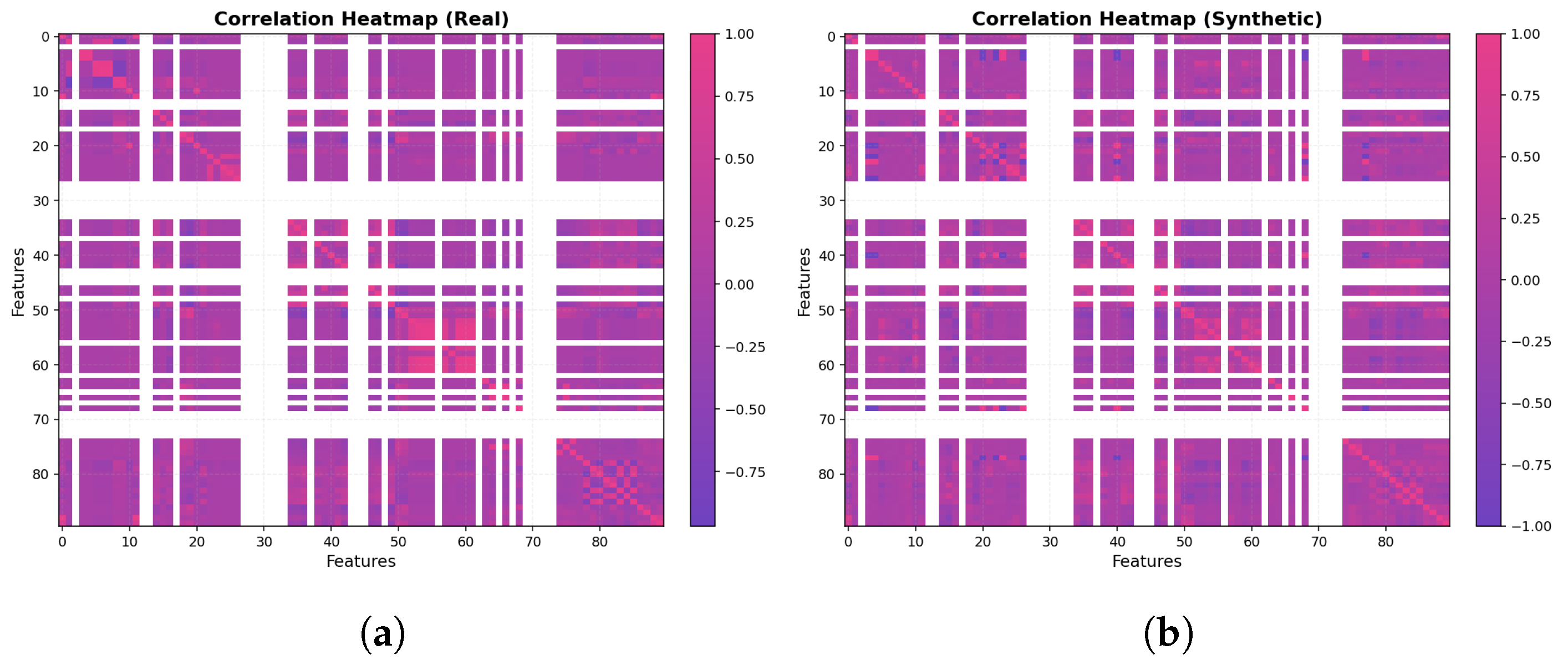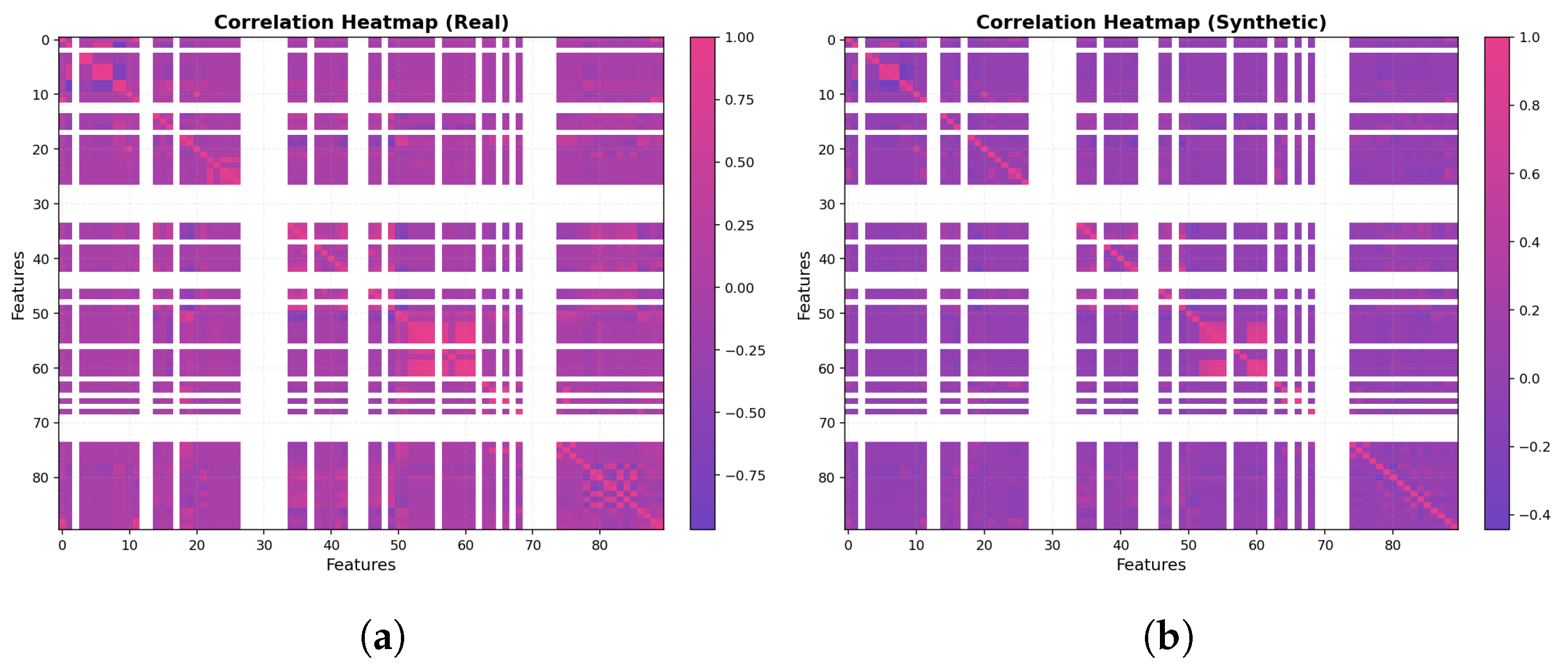 Figure 8b, the real and generated samples largely occupy the same regions, forming grouped clusters that align across both datasets. The synthetic clusters occasionally appear slightly denser or sparser than their real counterparts, reflecting intentional coverage of class imbalance, yet the overall map reads as a homogeneous mixture rather than separated swaths. This pattern indicates that, at the local-neighborhood scale emphasized by t-SNE, the generated data has effectively captured the same underlying manifold as the real data. In the correlation heatmaps