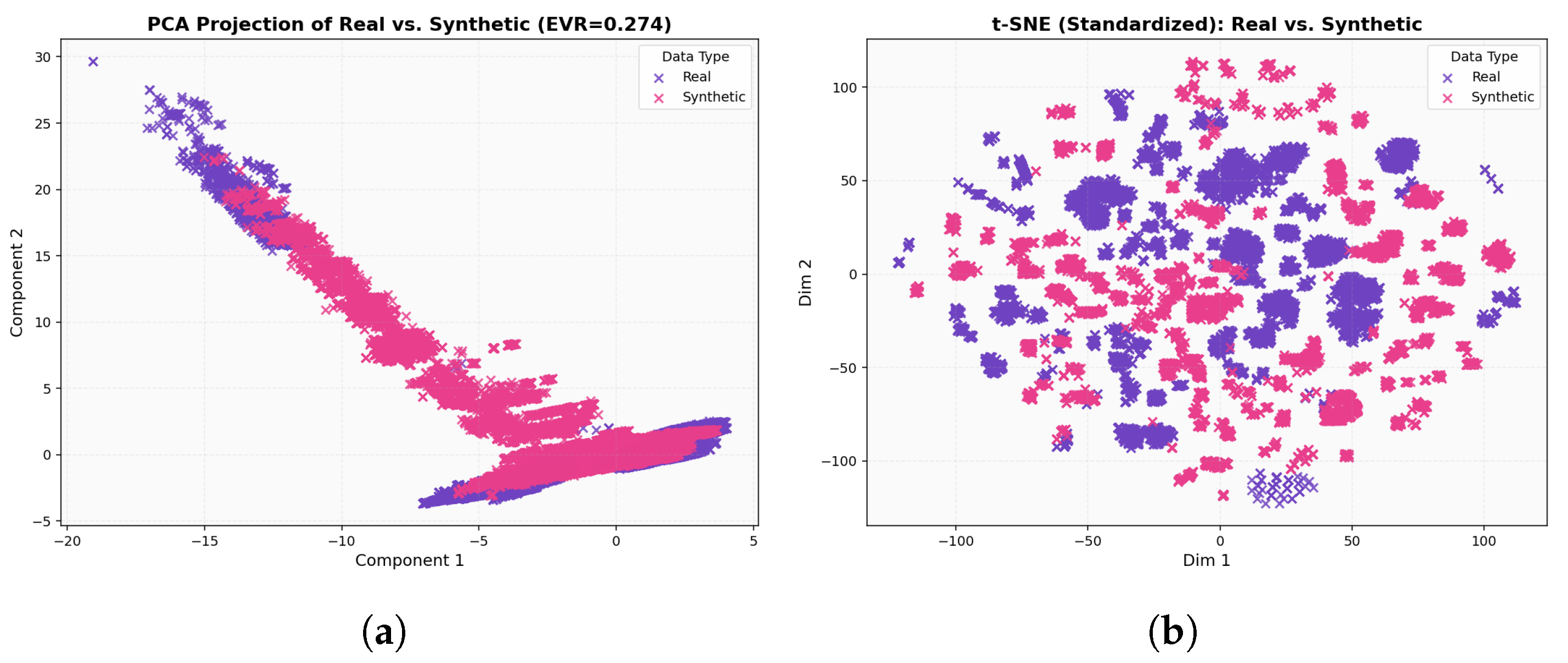 Figure 11a shows that real and synthetic samples occupy a broadly similar region of the feature space, with both clouds aligned along the same dominant manifold. However, the synthetic distribution appears slightly more compact and smoothed, with reduced spread in the extreme regions, indicating that CTGAN captures the main axes of variance but underestimates some of the tail behavior present in the real data. A complementary t-SNE visualization in