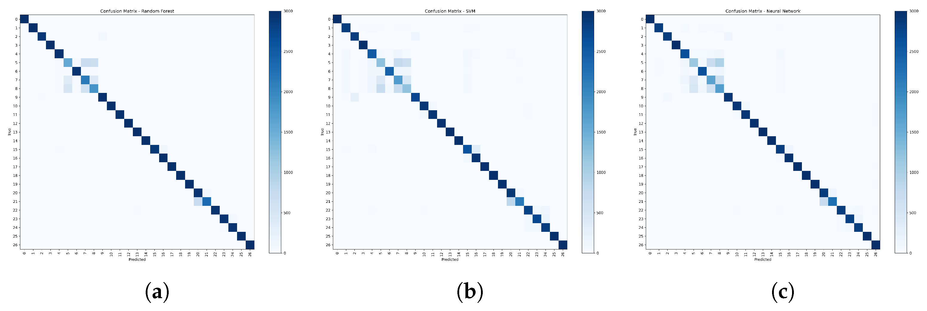 Figure 13 show strong main diagonal high accuracy with most errors concentrated among a small family of look alike devices chiefly D-LinkSensor, D-LinkWaterSensor, D-LinkSwitch, and the sibling plugs TP-LinkPlugHS110 and TP-LinkPlugHS100 which are frequently confused with one another. Random Forest yields the cleanest diagonal and the narrowest spill within this D-Link/TP-Link cluster; the neural network is close but exhibits slightly more bleed, while SVM shows the broadest cross-class confusion. Outside this cluster, several classes are classified almost perfectly, notably MAXGateway, HomeMaticPlug, Withings, iKettle2, and D-LinkDoorSensor. This pattern aligns with the aggregate metrics (Random Forest best on accuracy/F1) and suggests that remaining errors stem from intra brand similarities, motivating a hierarchical family first classifier or richer discriminative features to separate the D-Link/TP-Link subgroup.