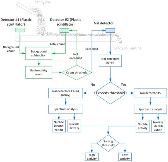 In this context, radioactive measurement-based sorting and volume reduction technologies have attracted increasing attention [13]. Commercially available systems such as the Segmented Gate System (SGS) have proven effective in site remediation applications [14,15]. However, their core technologies remain proprietary, and technical specifications are not accessible through standard procurement processes. Consequently, the development of application-specific sorting and volume reduction systems is critical for facilitating decommissioning and remediation operations.