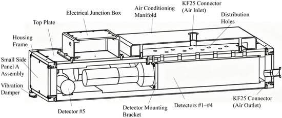 The operating environment of the plastic scintillator detector in this study could involve significant temperature fluctuations, mechanical vibrations, and even impacts. To ensure stable detector operation, the detector housing employed a stainless steel frame with aluminum alloy side panels. All six internal surfaces were equipped with thermal insulation layers and sealing gaskets. Vibration dampers were installed at the base to mitigate mechanical impacts during transportation. Additionally, a constant-temperature gas channel was incorporated to maintain a stable operating environment for the plastic scintillator. The plastic scintillators used in the radiation measurement system are polystyrene-based, specifically the UPS-923A model (Amcrys, Kharkov, Ukraine), each with dimensions of 800 mm × 400 mm × 50 mm, surrounded by solid white reflective material to enhance light collection efficiency. Two 2-inch photomultiplier tubes (Hamamatsu R6231 or equivalent, Hamamatsu Photonics, Hamamatsu, Japan) were coupled to opposite ends of the scintillator for signal readout. Each PMT was shielded with 0.6 mm thick mu-metal to minimize the influence of external magnetic fields. A cross-sectional view of the plastic scintillator detector housing is shown in Figure 2.