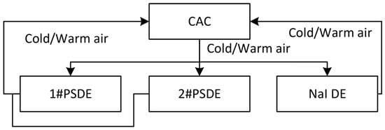Figure 4. Schematic diagram of the temperature control system. Abbreviations: PSDE—Plastic Scintillator Detector Enclosure; NaI DE—NaI Detector Enclosure; CAC—Cabinet Air Conditioner.