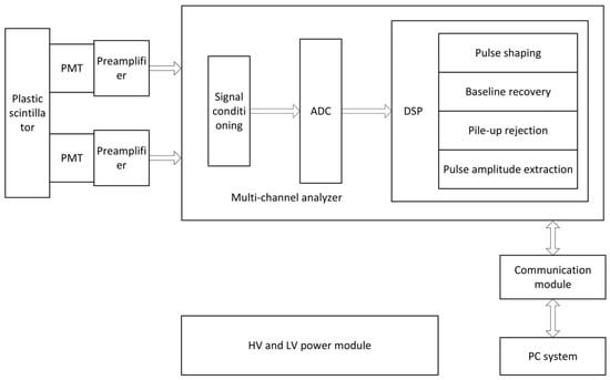 To achieve rapid and continuous measurement of radioactivity in sandy soil, a digital energy spectrum measurement system was designed specifically optimized to handle the high count rates and large signal dynamic range characteristic of large-volume scintillator detectors. Adopting a modular design philosophy, the system comprised a detector module, a signal conditioning and amplification module, a data acquisition and processing module, and a power management module. The overall system architecture is shown in Figure 5, with each module designed to achieve the core objectives of high energy resolution and high stability.