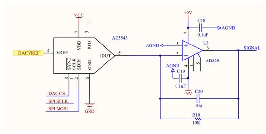 The faint current signal output by the detector via the photomultiplier tube is first converted into a voltage signal and preliminarily amplified by a low-noise preamplifier. Subsequently, the signal enters the conditioning and amplification board, sequentially passing through a pole-zero cancellation circuit (Figure 6) and a programmable gain amplifier circuit (Figure 7). The former effectively eliminates pulse trailing edge overshoot through frequency-domain zero compensation, shaping broad pulses into narrow ones while suppressing baseline drift and pulse stacking. The latter, composed of a digital-to-analog converter (DAC) and operational amplifier, dynamically adjusts signal amplitude under varying measurement conditions to ensure it remains within the optimal sampling range of the analog-to-digital converter (ADC). The introduction of programmable gain not only enables the system to adapt to signal amplitude variations across different radioactivity levels but also maintains spectral stability through automatic compensation when peak channel positions drift due to temperature changes. This design ensures the system maintains long-term stable operation even in complex environments.