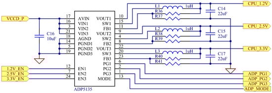 The low-voltage digital power supply circuit is shown in Figure 11. For digital circuits including the FPGA, MCU, and ADC, the design selected the high-efficiency switching regulator IC ADP5135 (Analog Devices Inc., Wilmington, DE, USA). By configuring feedback resistors, this IC generated the required 1.2 V, 2.5 V, and 3.3 V power supplies. The three outputs were enabled sequentially to meet strict power-up sequencing requirements. Throughout the power supply design, the analog and digital grounds were connected at a single point at the power input, and extensive decoupling capacitors were placed to maximize suppression of digital noise interference with analog signals.
