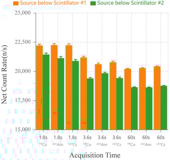 Substituting the experimental data into Equation (1), the background subtraction coefficient was calculated as k = 1.2031. To validate the derived correction coefficients, active measurements were conducted. The net count rates for the same source measured at different durations (1.8 s, 3.6 s, and 60 s) showed excellent consistency across both detector sets, as shown in Figure 13. Error bars indicate the statistical uncertainty calculated based on Poisson statistics as