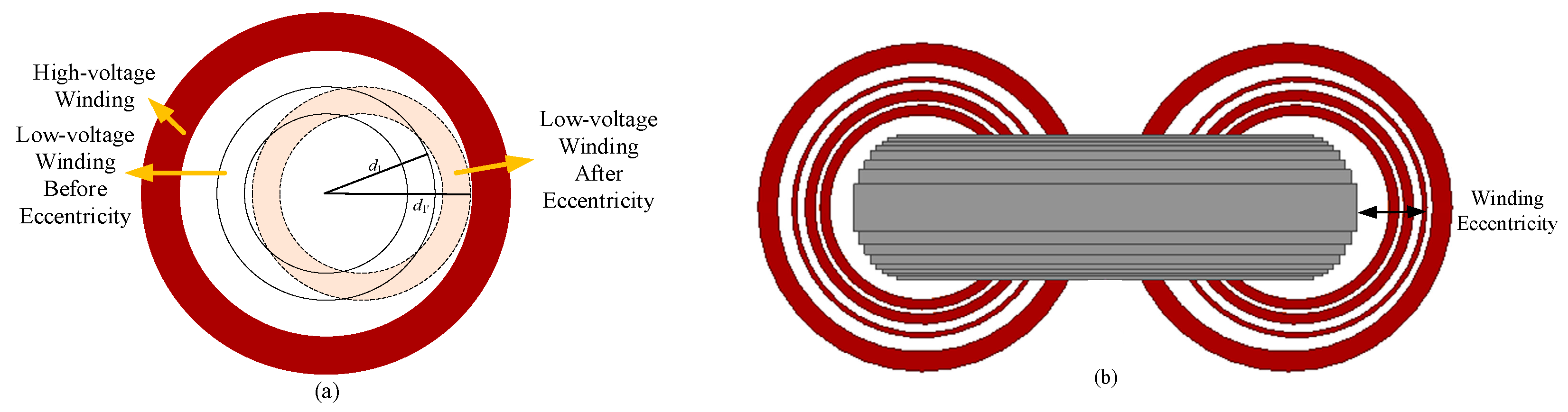 - Wu, S.; Zhang, F.; Dang, Y.; Zhan, C.; Wang, S.; Ji, S. A mechanical-electromagnetic coupling model of transformer windings and its application in the vibration-based condition monitoring. IEEE Trans. Power Deliv. 2023, 38, 2387–2397. [Google Scholar] [CrossRef]