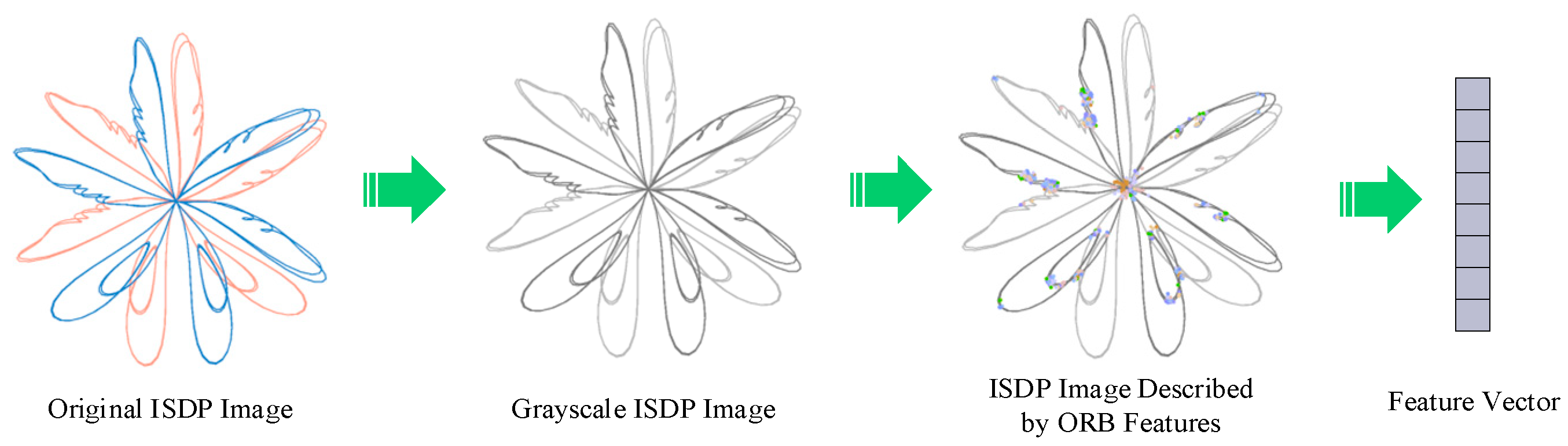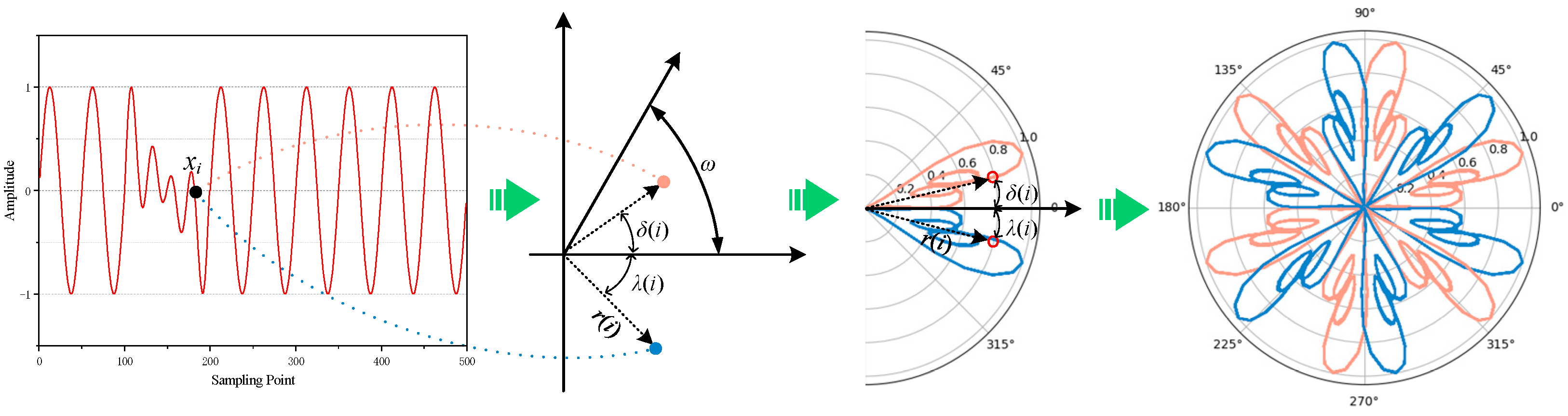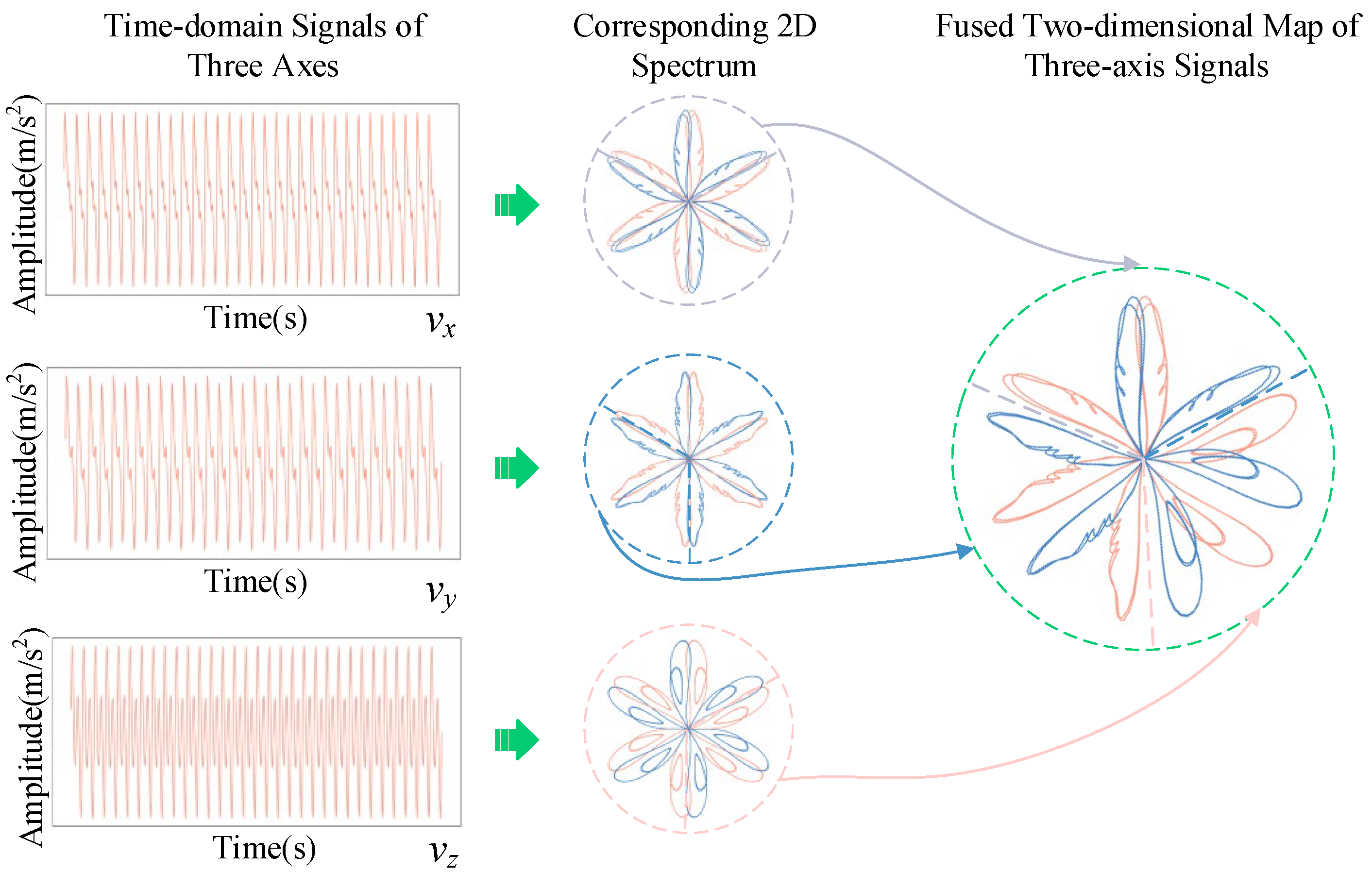 - Three-Axis Feature Aggregation and Dimensionality Reduction: An Improved Symmetrized Dot Pattern (ISDP) method is developed to aggregate and project the time- and frequency-domain features of x-, y-, and z-axis vibration signals into a unified two-dimensional map. This strategy preserves feature integrity while reducing data dimensionality and improving computational efficiency.