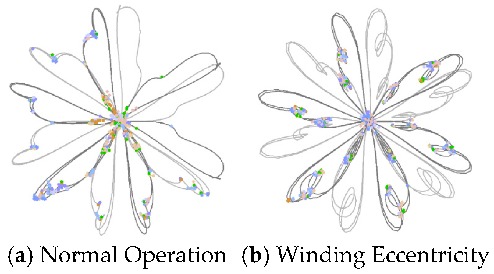 - Huang, L.; Wen, J.; Yang, Y.; Chen, L.; Shen, G. A Visual Fault Detection Method for Induction Motors Based on a Zero-Sequence Current and an Improved Symmetrized Dot Pattern. Entropy 2022, 24, 614. [Google Scholar] [CrossRef] [PubMed]