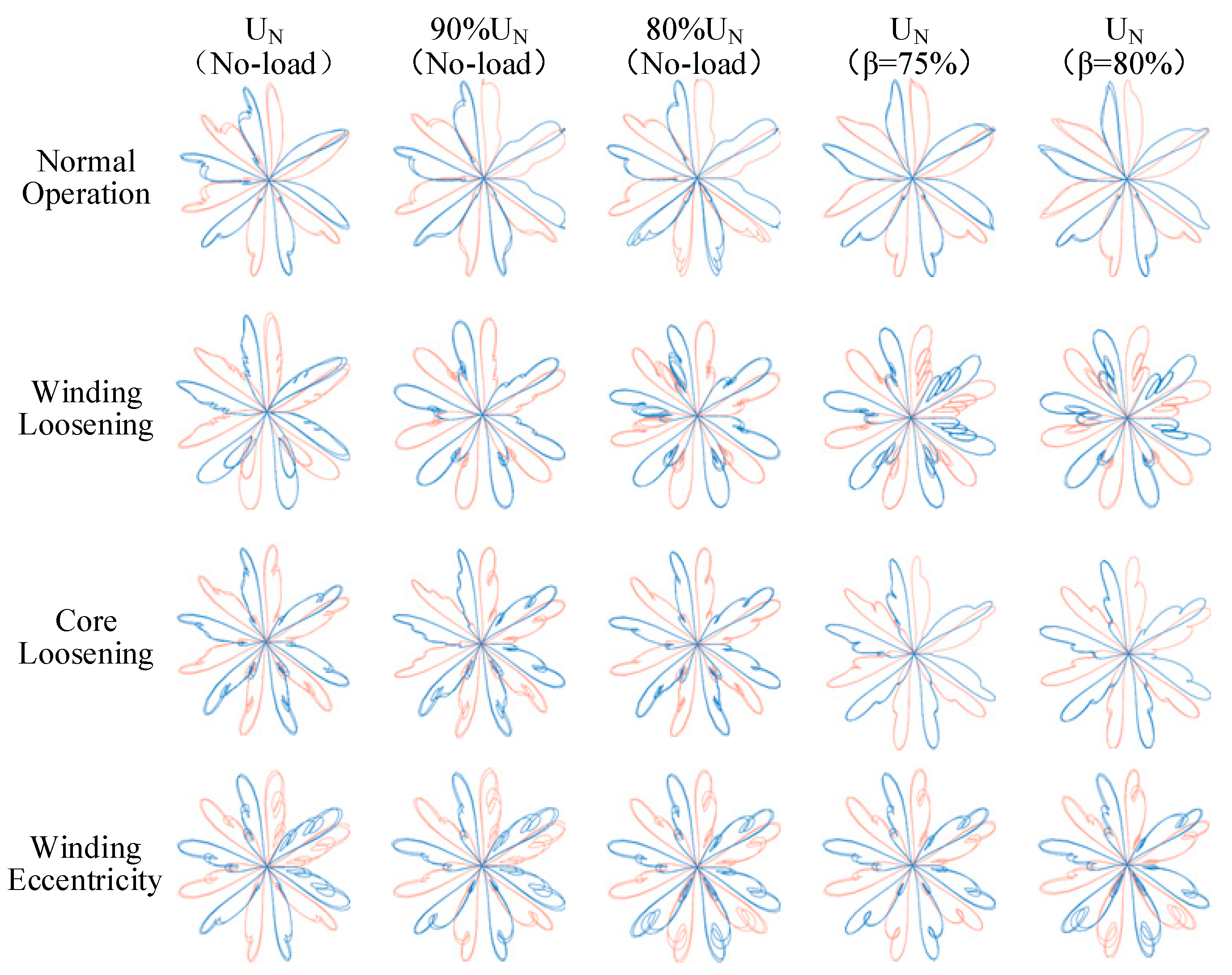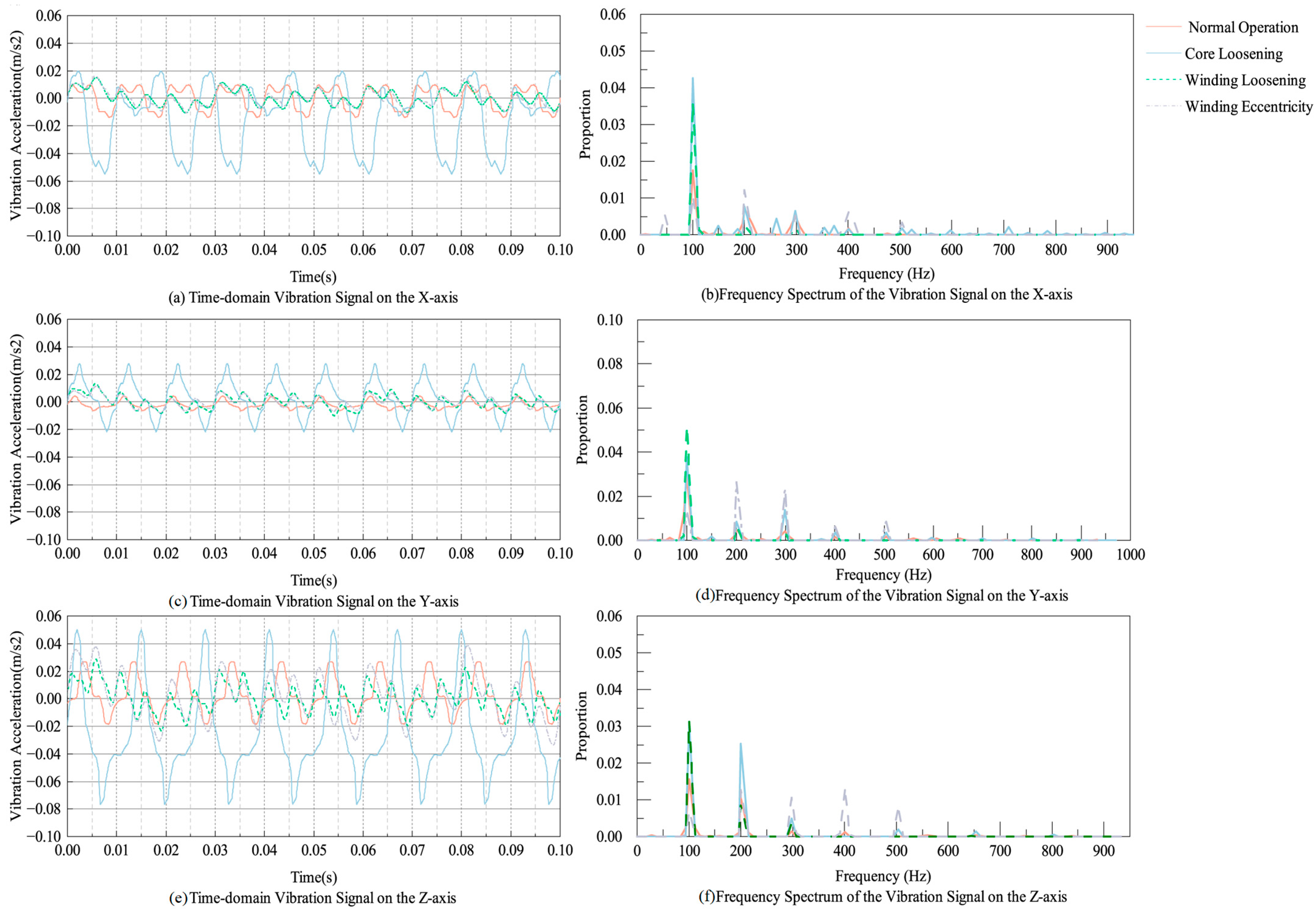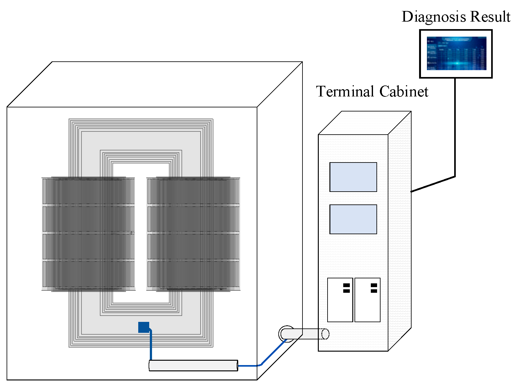 - It is worth noting that although this study examined various operating conditions and parameter variations, the focus was primarily on single-excitation dry-type transformers. Cross-validation with devices of different capacities and core geometries has not yet been conducted but will be addressed in future research. However, the proposed diagnostic framework is model-independent and based on the vibration characteristics of the general electromechanical mechanism, suggesting that it is transferable across different transformer types.