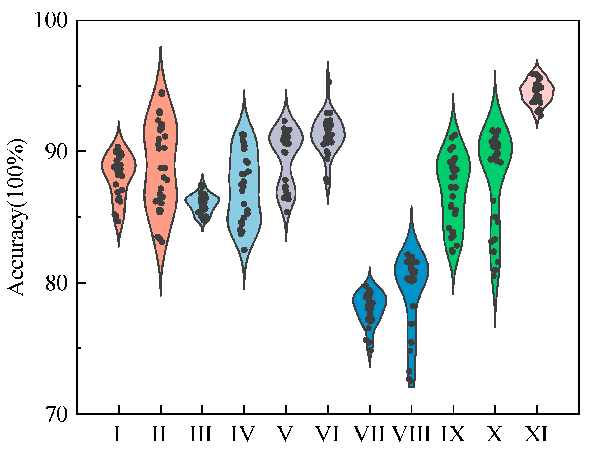 - Stability and Adaptability: The method demonstrates strong stability and adaptability in multi-class fault diagnosis, maintaining minimal variation across different fault types and conditions. It is effective in resource-constrained environments, well-suited for real-time monitoring, and provides valuable support for operational decision-making, with potential for broader application in other transformer types.