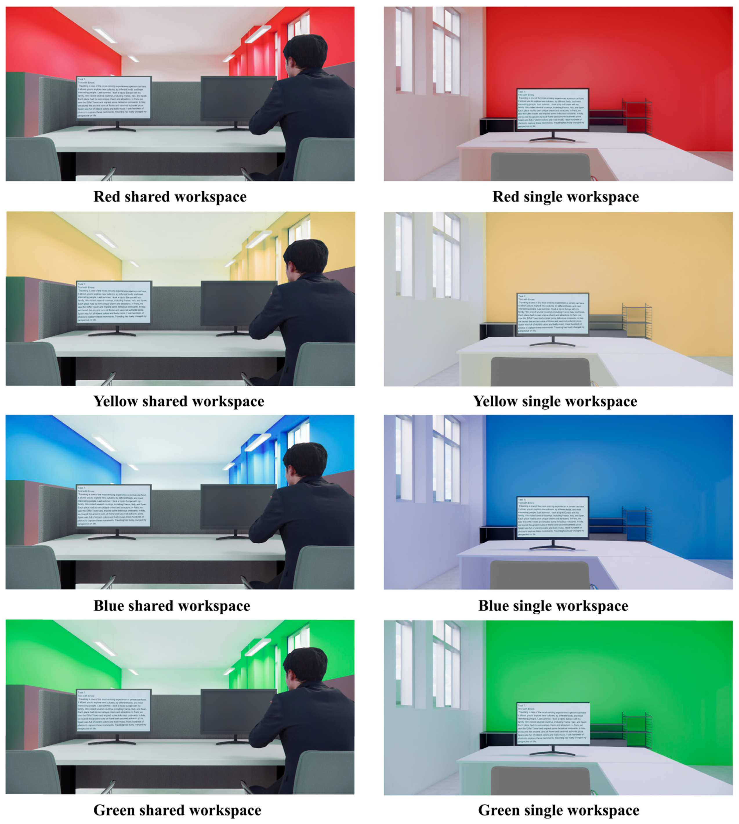 The study employed immersive virtual reality (VR) to simulate different workspace scenarios, which served as visual stimuli to elicit the participants’ emotional responses. Based on existing studies regarding color–emotion associations, red, yellow, blue, and green were selected as the crucial visual variables for this experiment, as they have been demonstrated to evoke a broad spectrum of emotions. Additionally, two prevalent workspace types, “shared workspace” and “single workspace”, were included as a second experimental factor. These workspace conditions were crossed with the color variations to create the full set of experimental conditions (