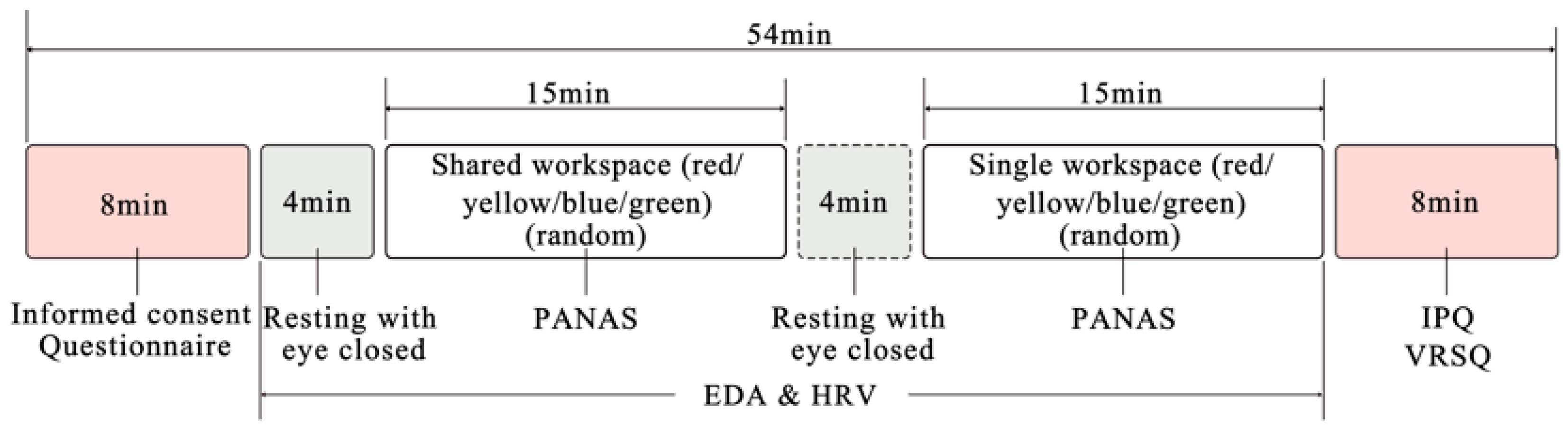 45]. The experiment comprised two sets of VR panoramic scenes: shared workspace and single workspace, with four scenes in each set. The order of the two sets was fixed (shared followed by single). However, the scenes within each set were presented in a randomized order to prevent sequence effects and biases that could arise from a fixed or balanced presentation. Each scene was viewed for 3 min, followed by a 1 min rest interval. This was followed by a mandatory 1 min rest interval to allow physiological arousal and subjective emotional state to return to baseline, thereby preventing carry-over effects and ensuring that each trial’s data reflect its specific stimulus. A 4 min eyes-closed rest period was provided between the two sets. Upon completion, participants filled out the IPQ and the VRSQ. A researcher was present throughout the entire process to provide assistance (