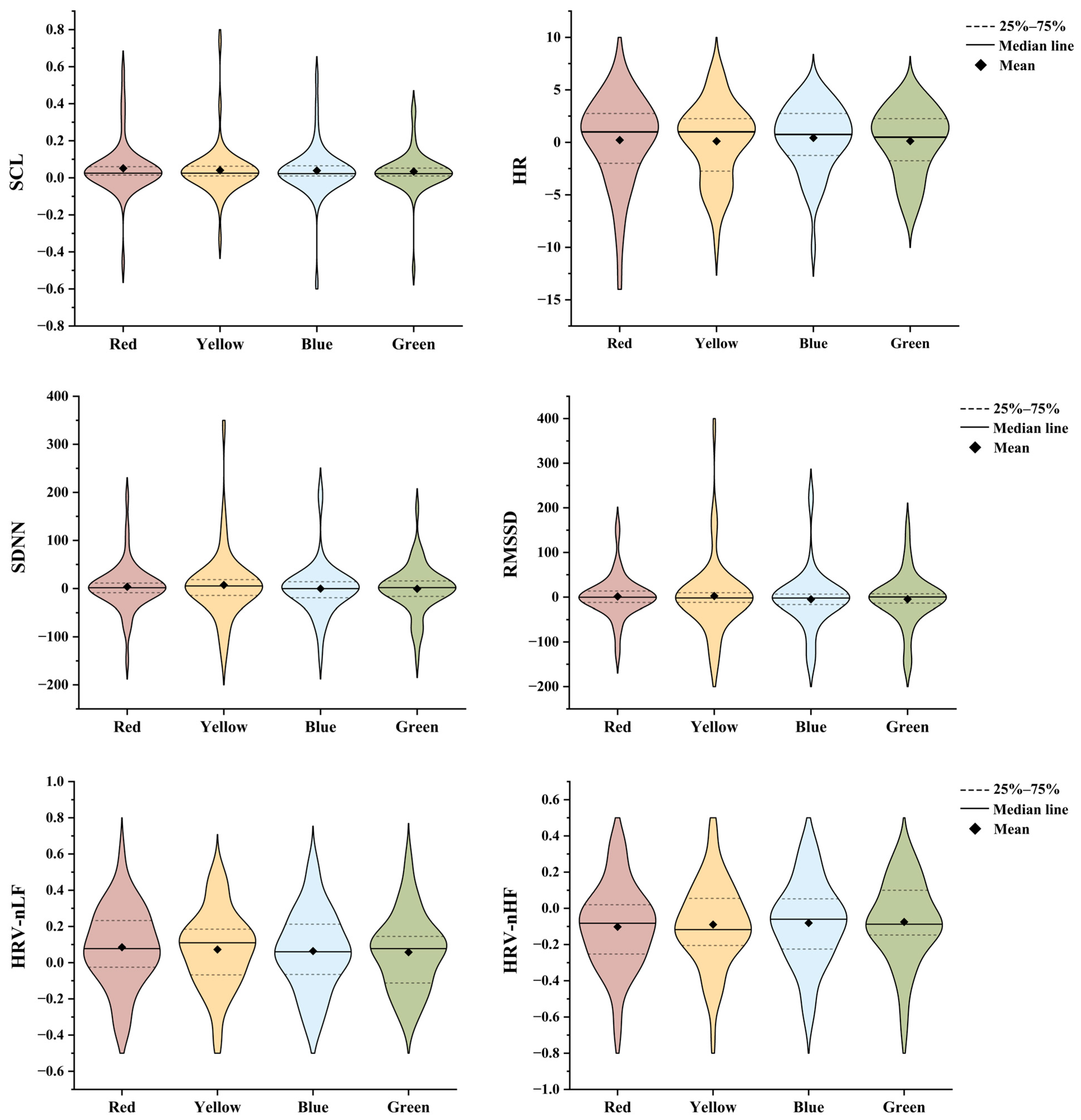 The statistical analysis of the physiological data yielded a clear and consistent pattern across the four colors. Specifically, for the key indicators of autonomic nervous system activity—including skin conductance level (SCL) and the heart rate variability indices of HR, SDNN, RMSSD, HRV-nLF, and HRV-nHF—the results of the test showed no statistically significant differences. This conclusion is supported by the obtained p-values: SCL (p = 0.411), HR (p = 0.586), SDNN (p = 0.425), RMSSD (p = 0.793), HRV-nLF (p = 0.615), and HRV-nHF (p = 0.404), all of which were substantially greater than the conventional alpha level of 0.05.